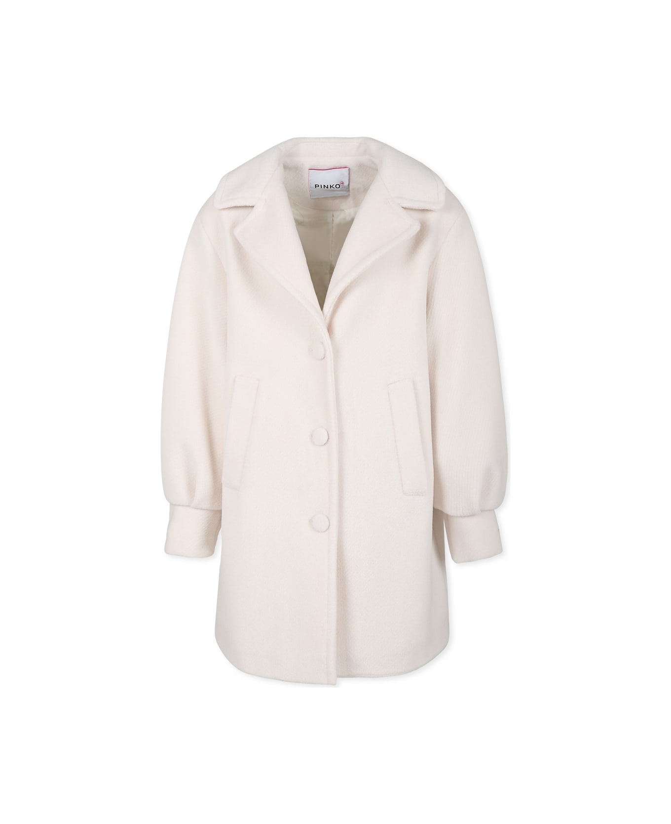 Ivory cloth coat, long sleeves, with lapel collar, front button closure and side pockets. It is embellished with an embroidered logo on the sleeve.