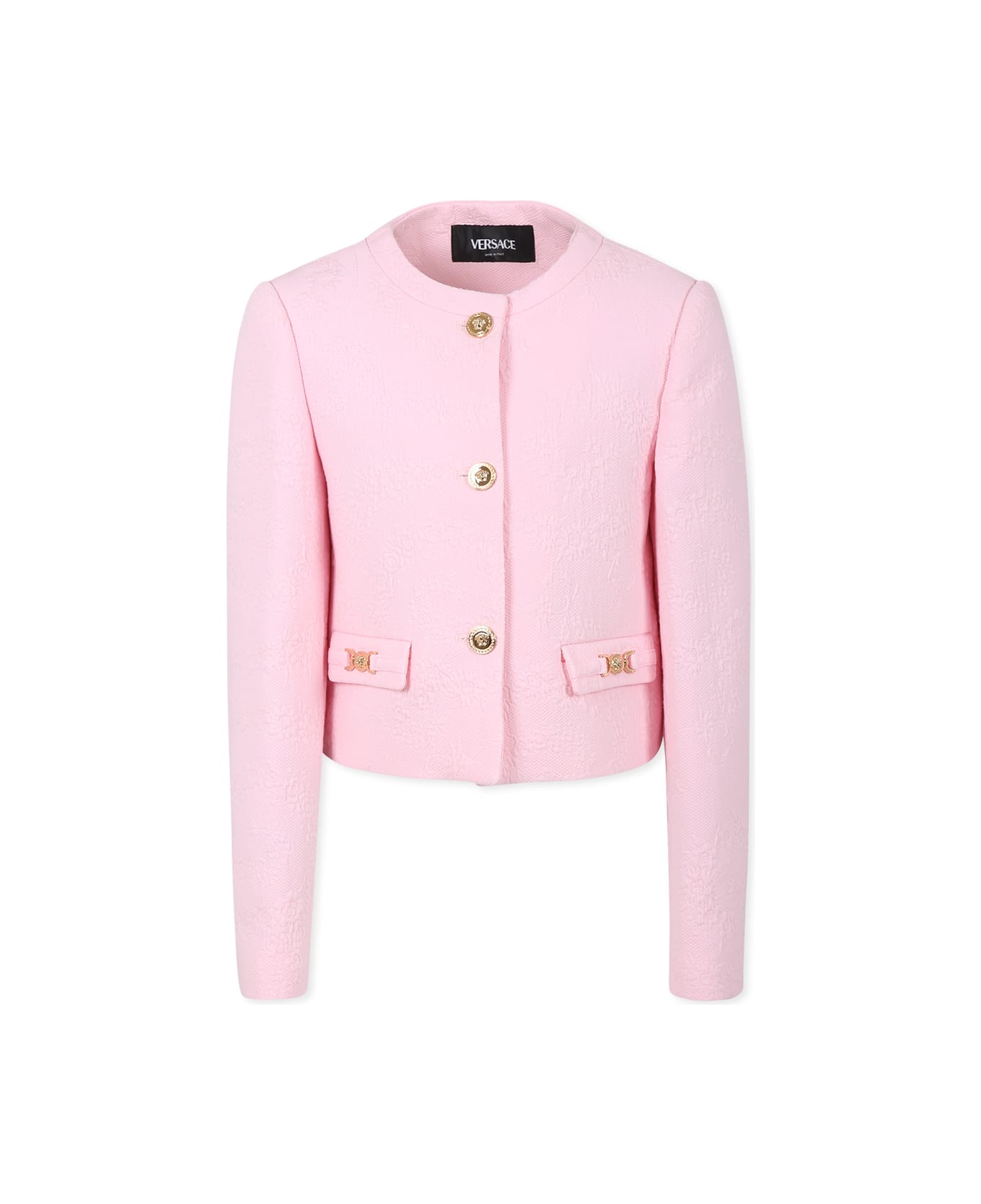 Pink jacket from the luxury brand Versace, made of jacquard cotton. The long-sleeved model features a round neckline, a front fastening with Medusa buttons and a flap on the sides with Medusa '95 detail. It is embellished with an all-over floral swirl pattern.