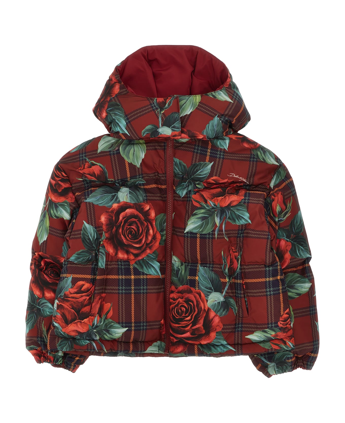 'Tartan rose' down jacket with all-over print, zip closure and elastic cuffs. Composition: 100% polyester