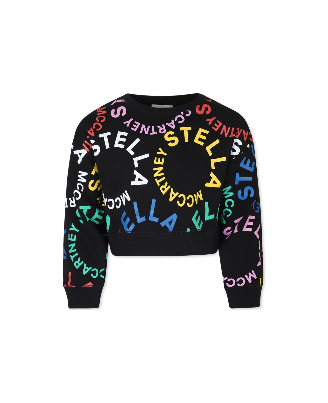 Black cotton fleece crop sweatshirt, long sleeves, with ribbed crew neck, cuffs and hem. It is embellished with all-over circular logo.