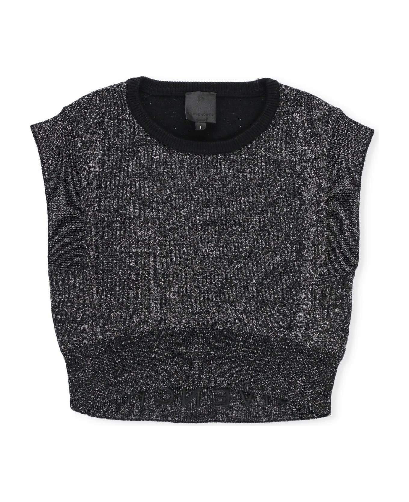 - Black Givenchy Junior cotton sweater for girl - Elastic ribbed round neck - Sleeveless - All-over lurex details - Rear tone on tone embroidered logo at hem Composition: 83% Cotton, 11% Polyester, 6% Lurex