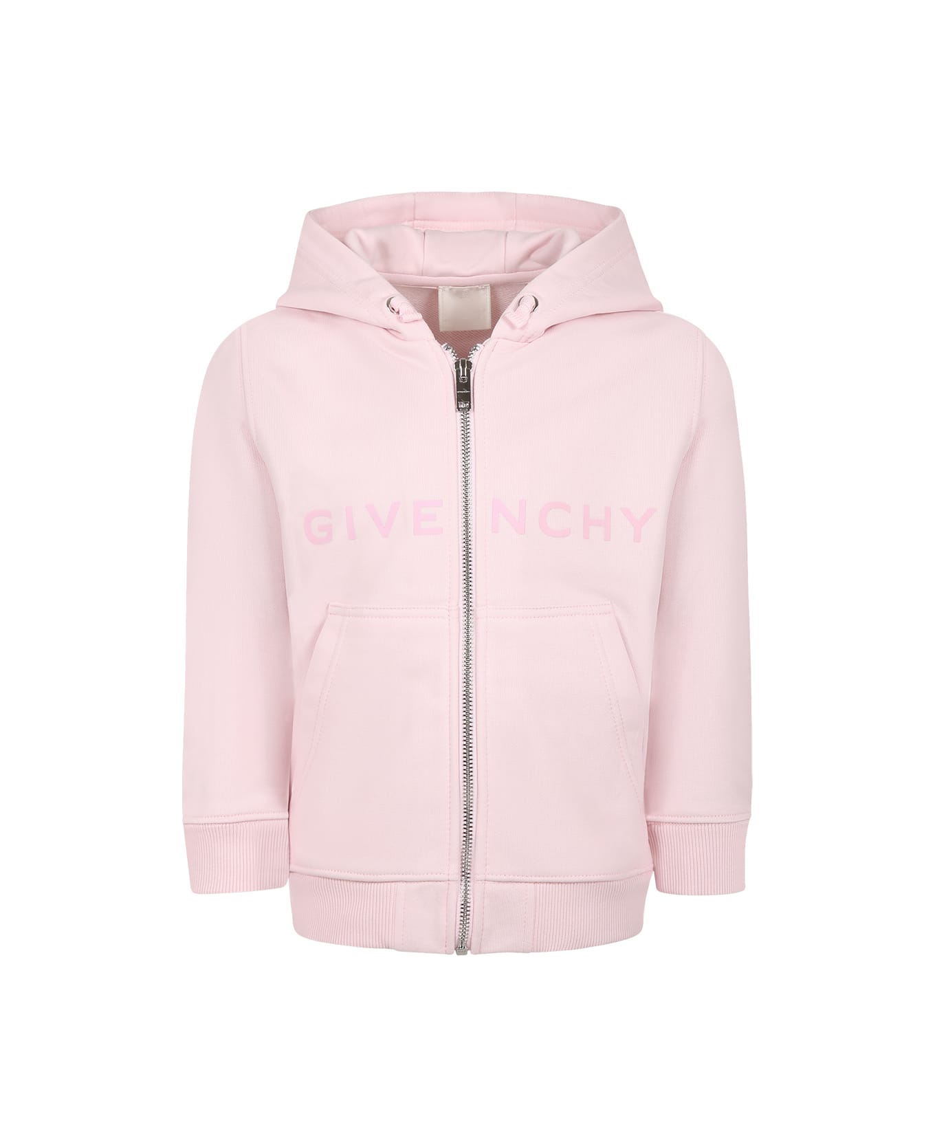 Pink sweatshirt from the French luxury brand Givenchy, made of a brushed cotton blend, with long sleeves, a hood, a front zip fastening, side pockets, ribbed cuffs and hem. It is embellished with pink logo on the front and iconic 4G motif on the back.