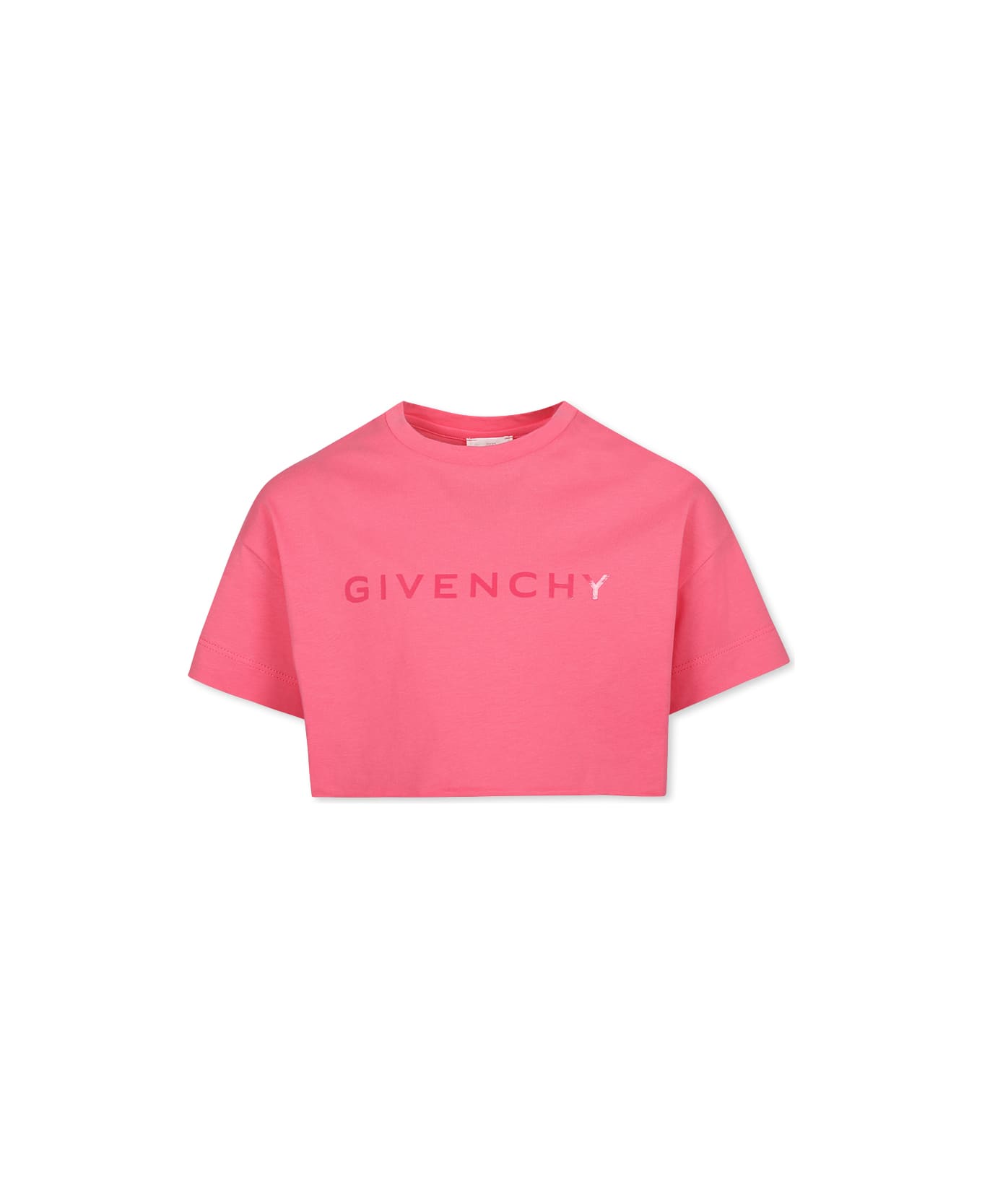Pink crop t-shirt from the French luxury brand Givenchy, made of organic cotton jersey, with short sleeves, ribbed crew neck and raw cut hem. It is embellished with front logo and iconic 4G motif on the back.