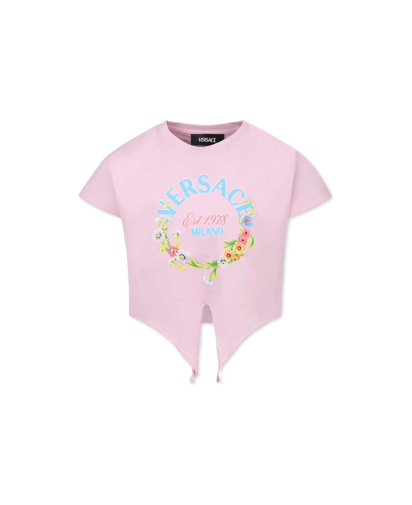 Pink crop t-shirt from the luxury brand Versace, in cotton, with short sleeves, ribbed crew neck and knot on the front. It is embellished with floral Versace logo on the front.