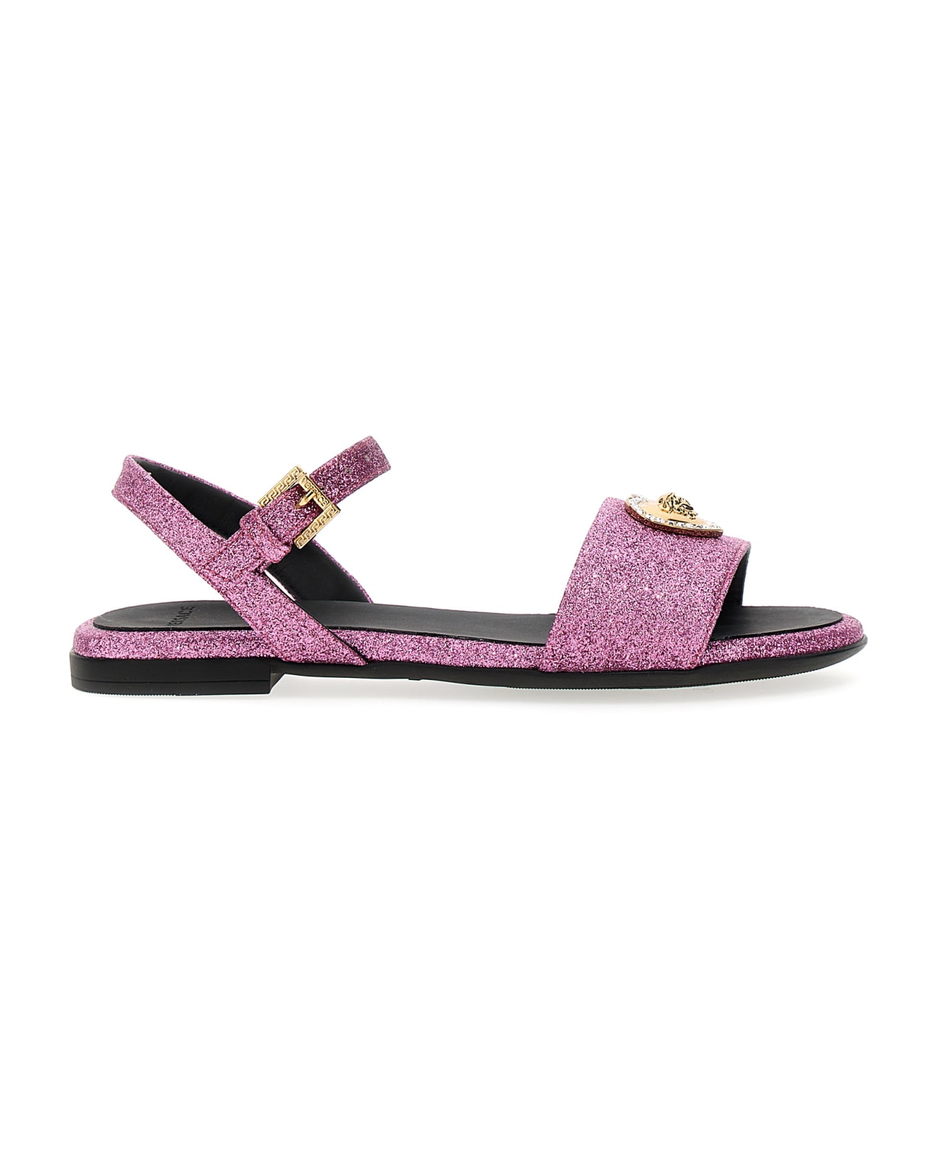 Glitte sandals with 'Medusa' plaque appliqué and crystals and an ankle strap. Composition: 80% polyester 20% viscose