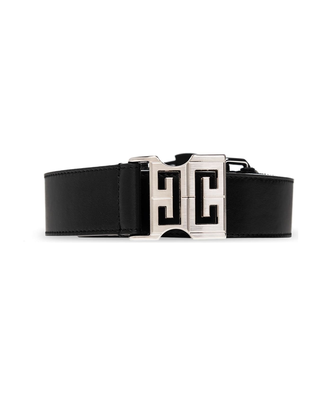 Black belt from Givenchy. Crafted from leather and fabric, this item features a jacquard logo pattern and brass 4G buckle in silver-tone.