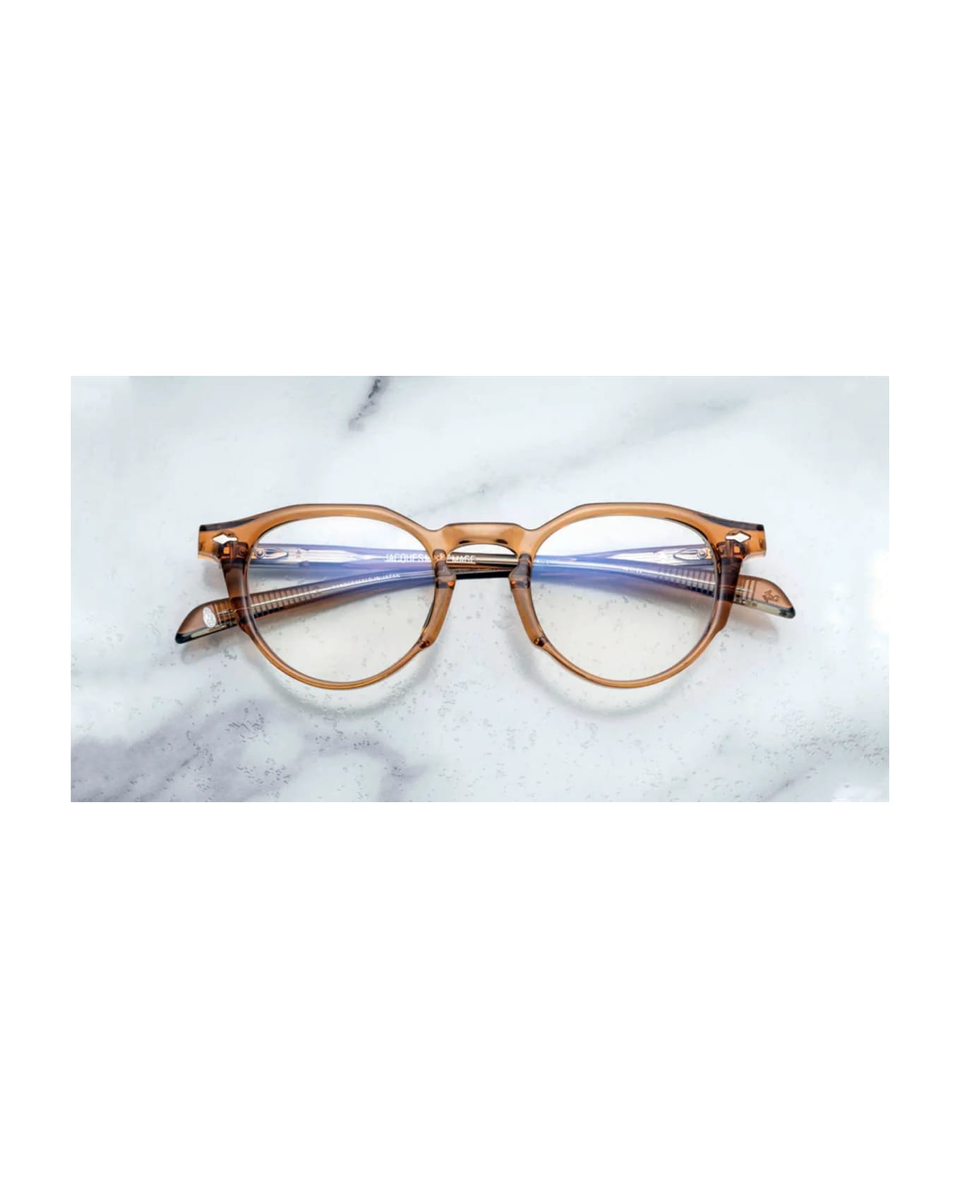 Jacques Marie Mage Sheridan Whiskey eyeglasses feature a modified Boston lens shape with modern surfacing cuts, silver signature arrowhead front pin, monoblock custom hinge system with contrasting - Color rivets and embossed hairlines decoration and burgundy domed 3D metal cameo logo.