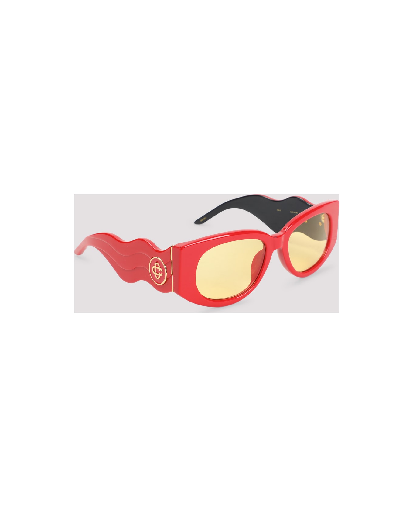 Casablanca Red Acetate Oval Wave Sunglasses. Red acetate sunglasses, tonal oval frames, canary yellow lenses, side gold-tone signature logo, tonal wave temples.