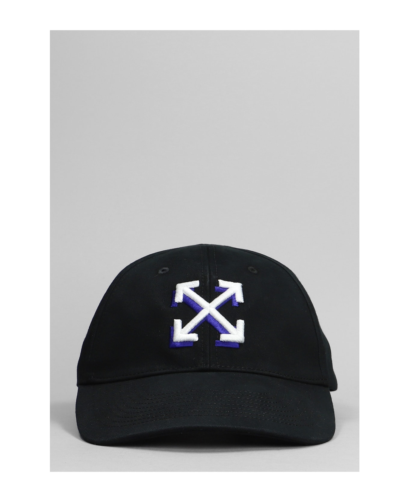 Hats in black cotton, embossed front logo, curved peak, adjustable belt, stitching detail, 100% cotton