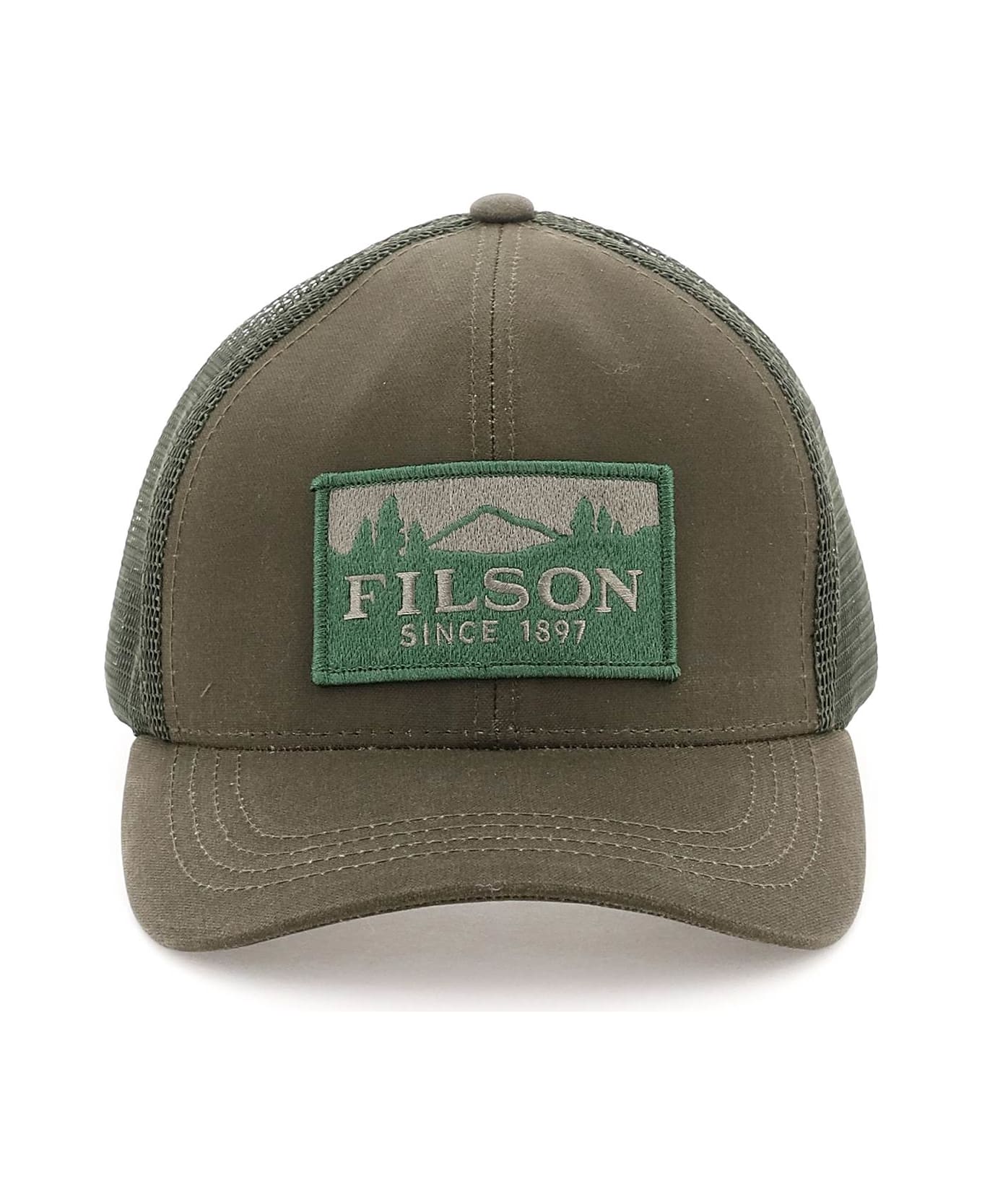 Filson trucker cap crafted in cotton canvas with mesh back, featuring front logo patch. Rear adjustable strap with antique gold-finished metal buckle with engraved logo. Unlined.