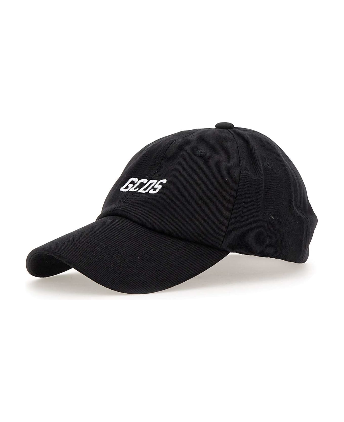 GCDS "Wear Milano" men's baseball cotton hat, black, white logo embroidered on front and back, adjustable back strap with velcro. One size.