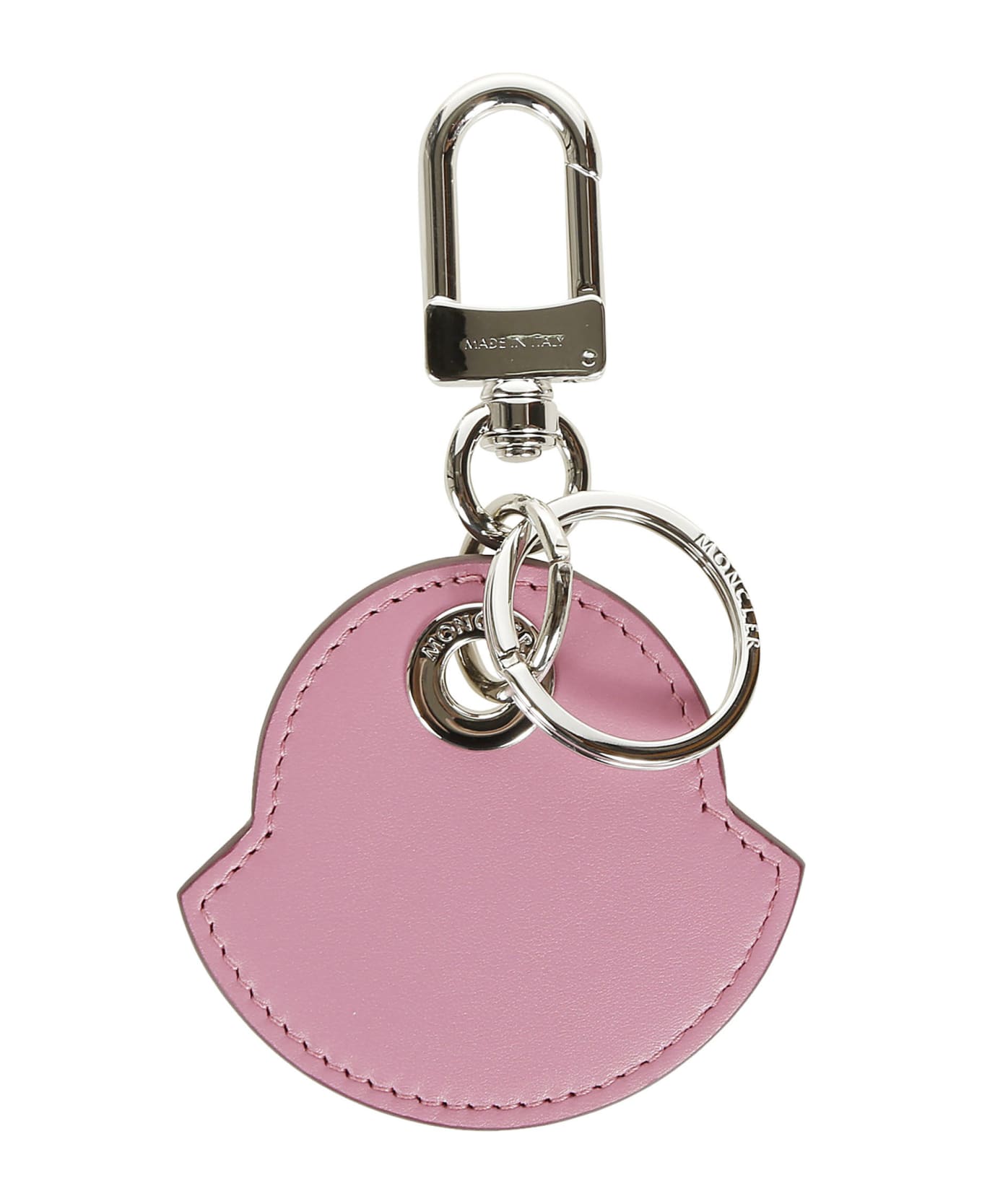 Charm Keyring from Moncler: Pink Charm Keyring with silver tone hardware and logo shaped hanging tag.