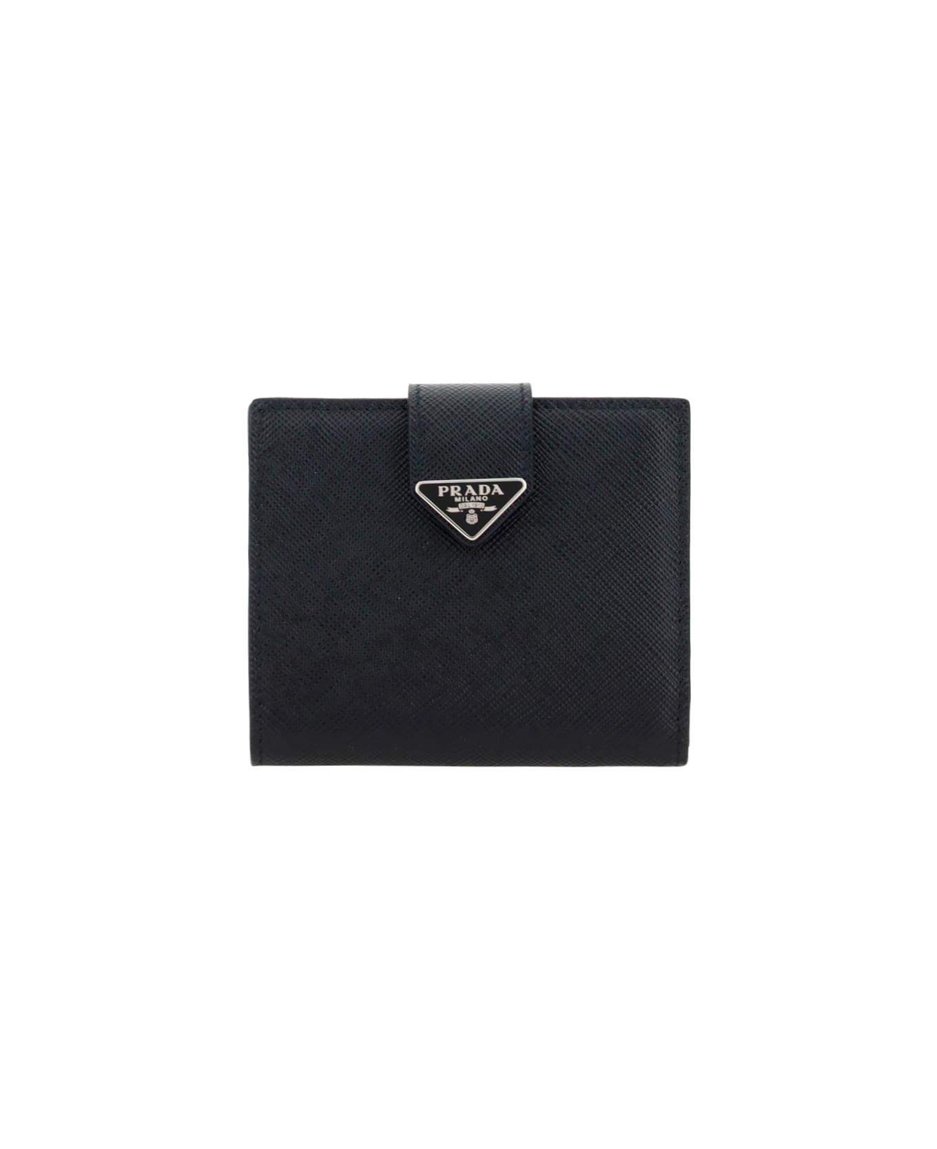 Calfskin wallet by prada, external magnetic flap closure, card slot inside, internal banknote compartment, grained leather design, triangular plaque with iconic brand monogram in contrasting colour on the front, iconic brand signature printed on the inside. Composition: 100% % Calf Leather Bos Taurus