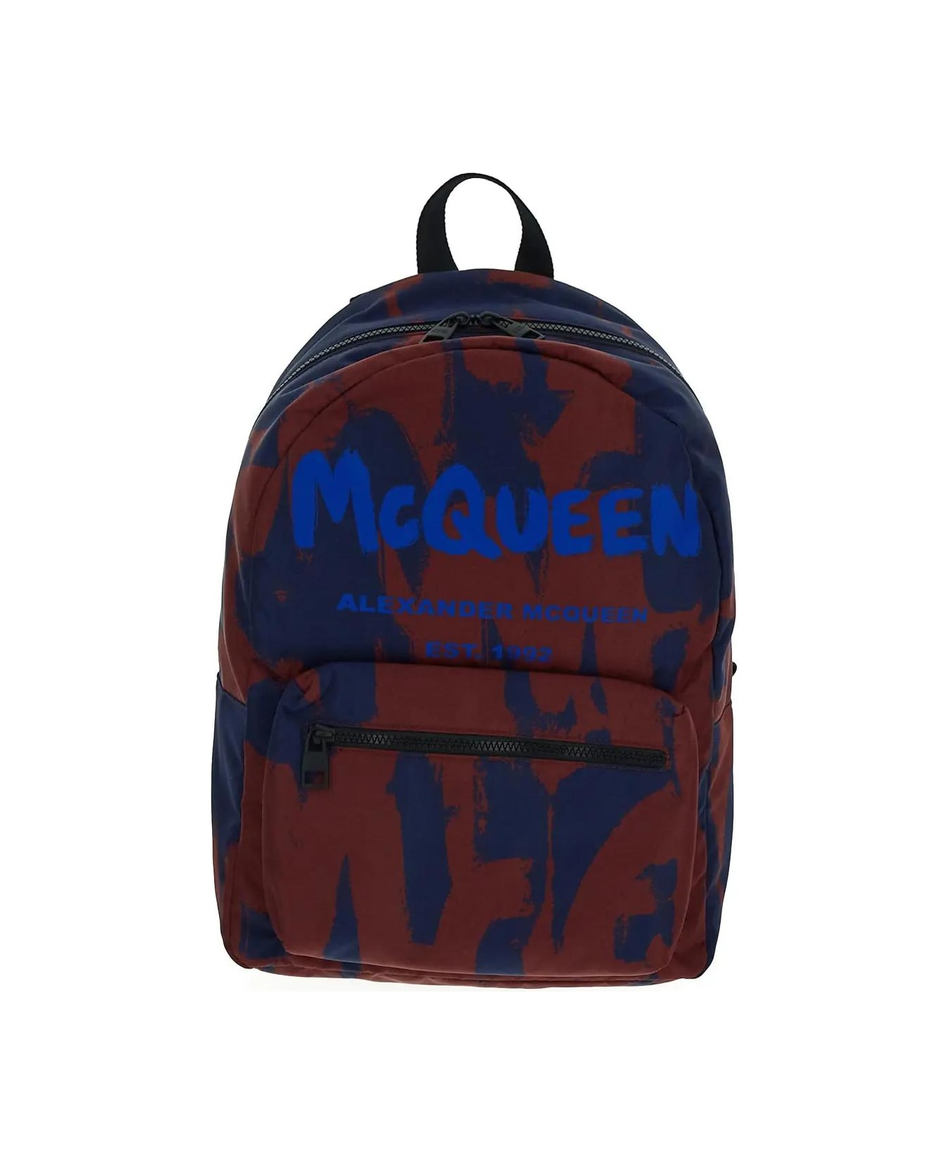 Alexander McQueen backpack in garnet and navy blue polyester with all-over Graffiti logo motif, electric blue Graffiti logo printed on the front, top handle, adjustable shoulder straps, front zip pocket, top zip closure, a main compartment, an internal computer pocket, on open pocket, a card slot and black matte finish metal hardware.