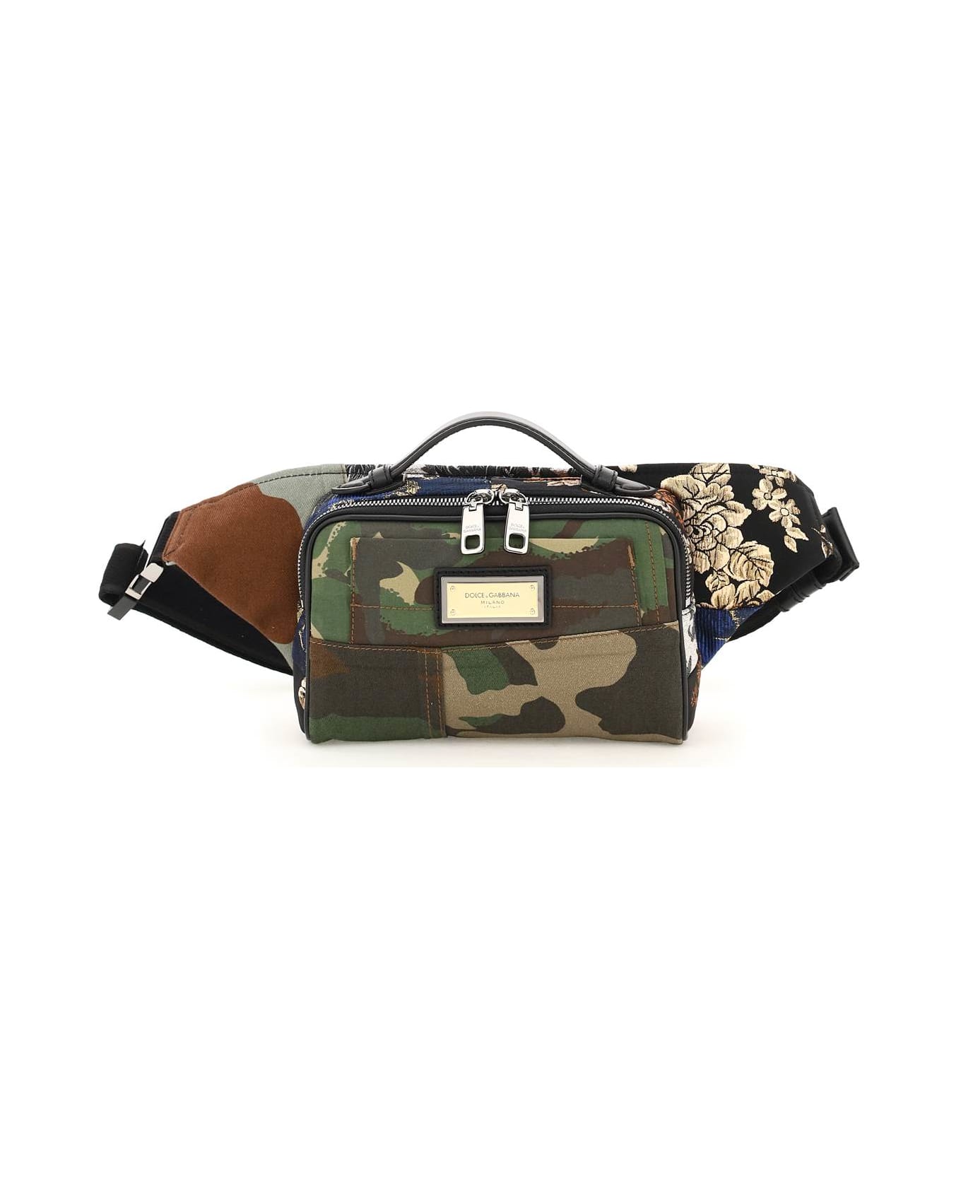 Dolce & Gabbana belt bag in patchwork camouflage fabric, enriched with damask fabric sections and leather piping. Iconic bi-galvanic logo plate applied on front, sliding top handle and adjustable fabric belt with leather details and metal snap-buckle with engraved logo. Rear zipped flat pocket, two-way zip closure, fabric lining. Ruthenium-finished metalware.