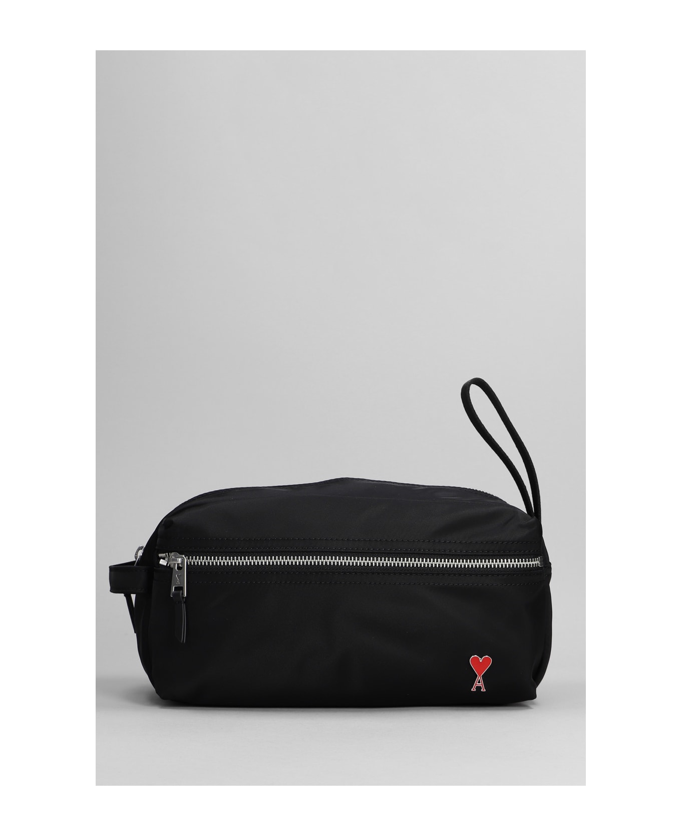 Clutch in black polyester, Height 135 mm, Width 270 mm, Height 135 mm, Wristlet, zip clousure, frontal zip pocket, Made in China