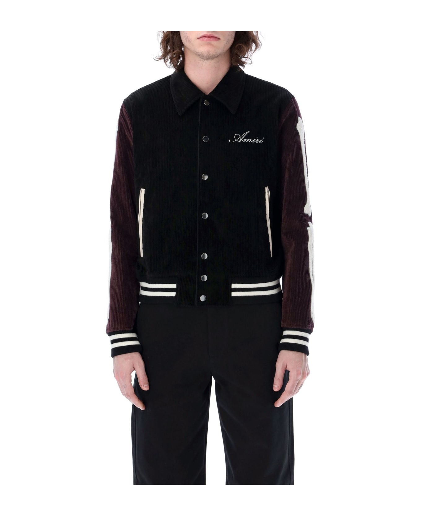 Wool-blend Corduroy Bones Varsity Jacket By Amiri. Featuring: Point Collar Snap Button Fastening Zipped Pockets Amiri Logo Embroidery At Left Chest Long Sleeves With Terry Bones Detail Ribbed Cuffs And Hem Model Is 1,90 M Tall And He Is Wearing Size 48