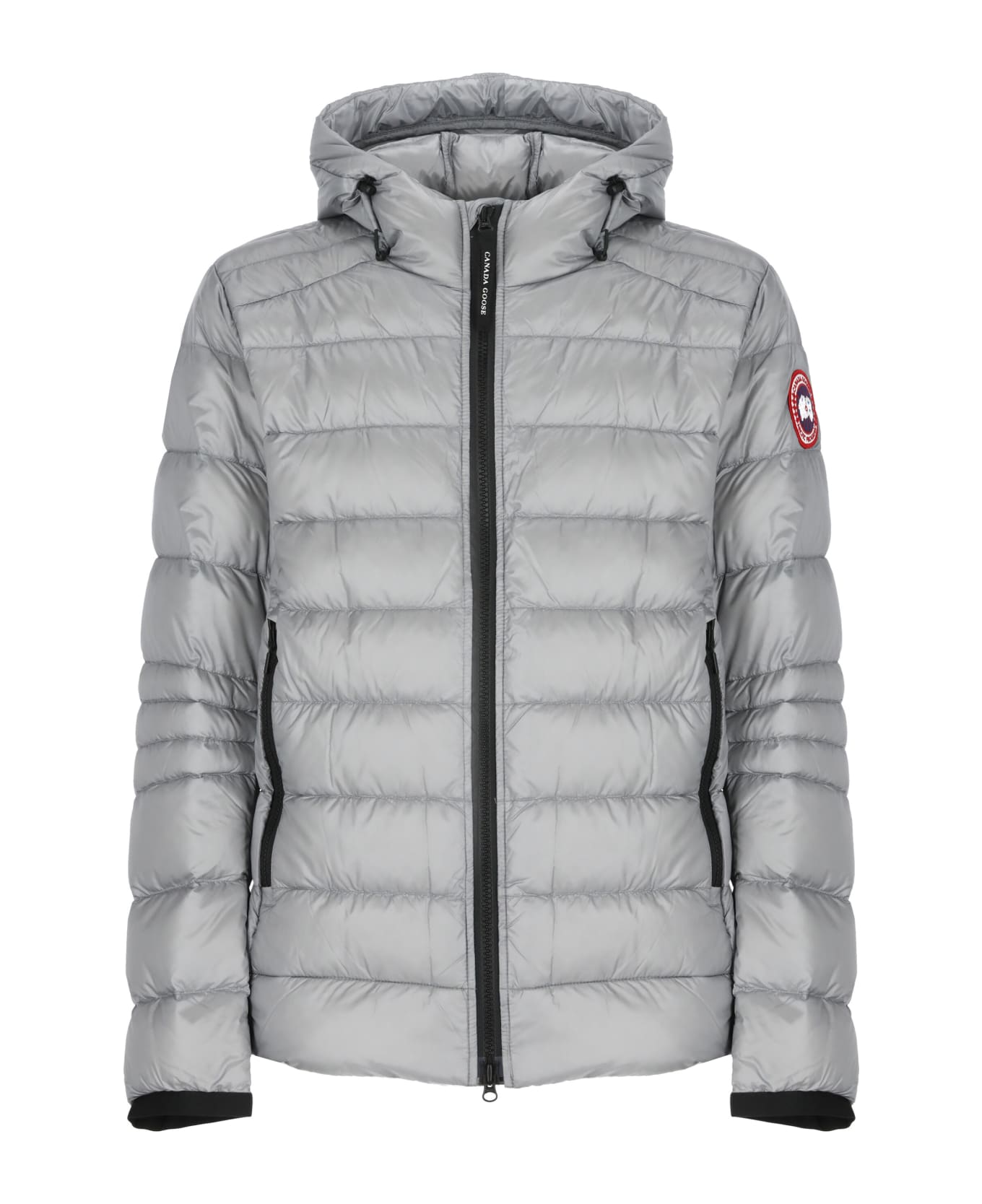 - Grey Canada Goose quilted down jacket for man - Hood with drawstrings - High neck with rear contrasting color detail - Long sleeves with elastic at cuffs - Two front zip pockets - Contrasting color embroidered logo at left sleeve - Drawstrings at hem - Three internal pockets - Front dubble slider zip fastening Composition: 100% Polyamide Filling:, 90% Duck Down, 10% Duck Feather