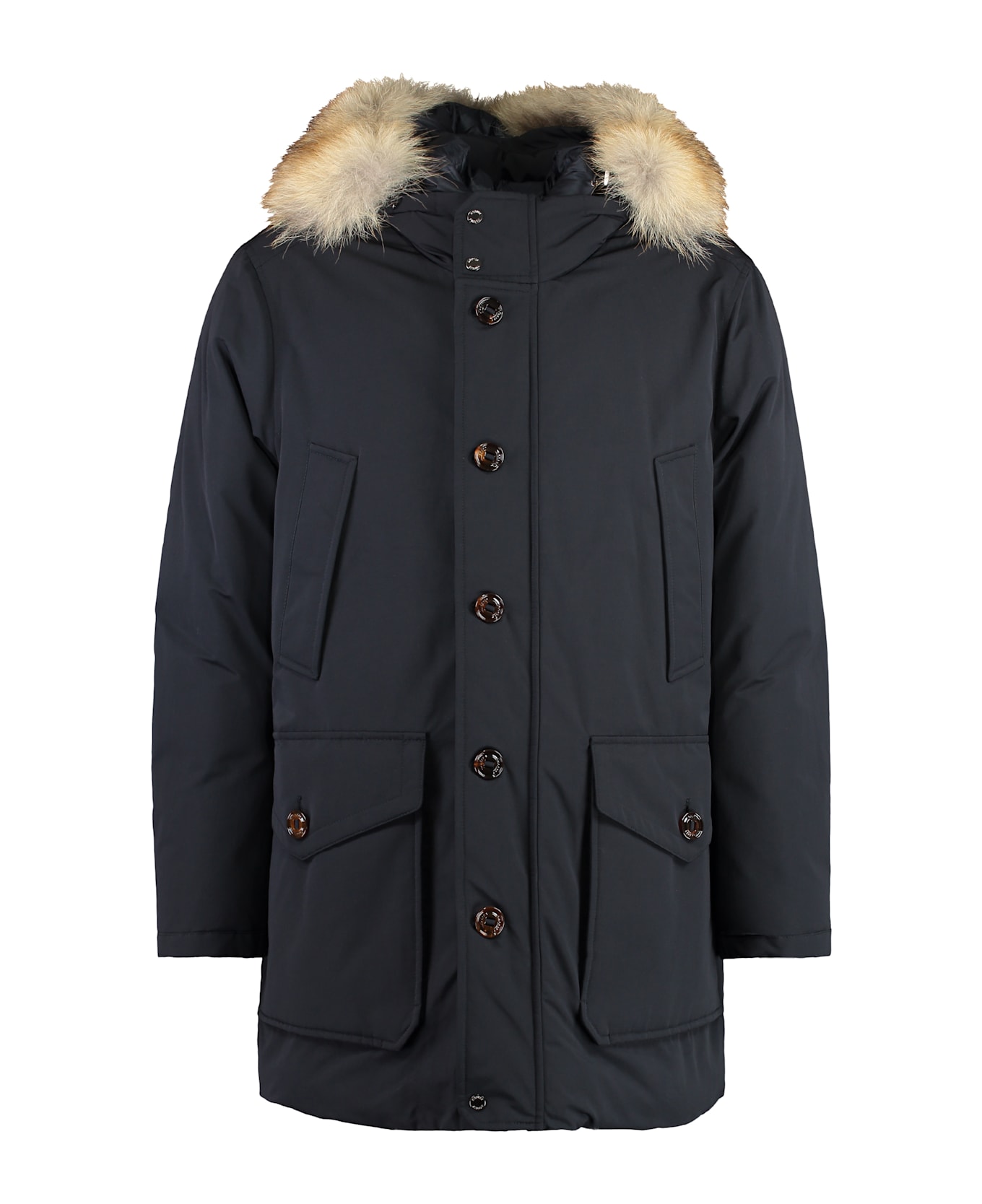 Hood with removable fur two hand warmer pockets two buttoned front flap pockets adjustable drawstring waist padding: 100% goose down 53% cotton, 47% polyester Composition: 53% % Cotton, 47% % Polyester