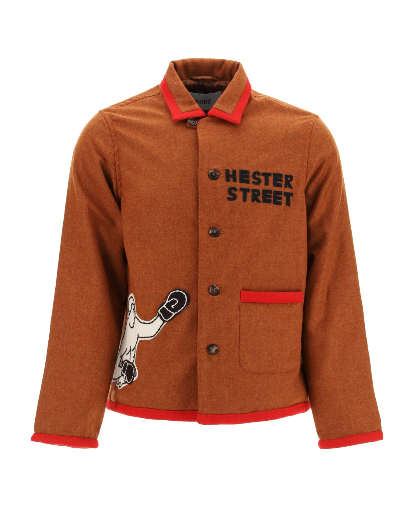 Bode shirt-cut jacket in merino wool with contrasting felt trims, made in a varsity blanket style from reproductions of antique fabrics, decorated with boxing-themed felt patches. Pointed collar, horn buttons, one patch pocket, cupro lining. Fabric and finishes may vary, each item is unique. The model is 187 cm tall and wears a size M/L.
