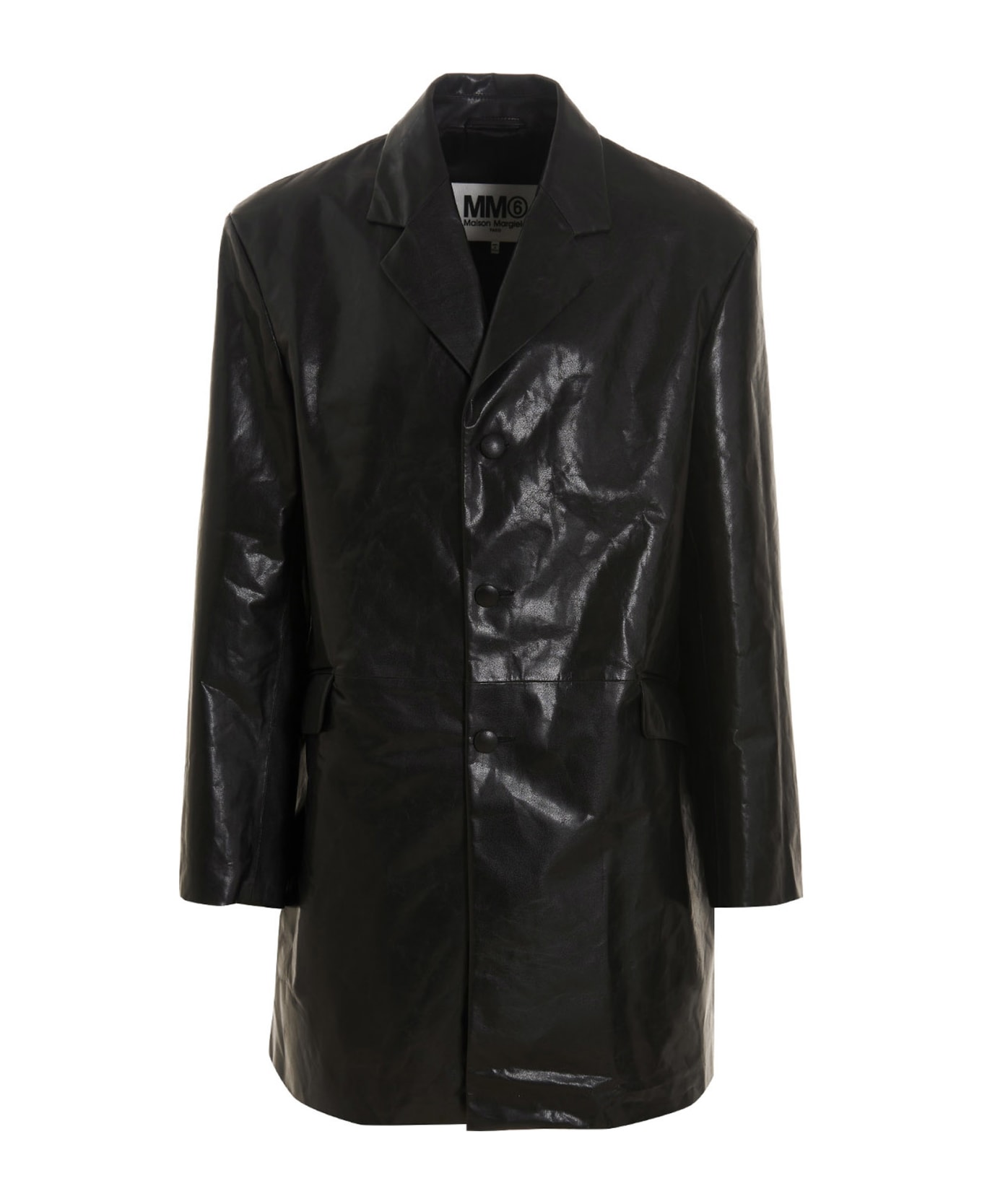 Coated effect leather coat with a button closure, pockets, long sleeves and a back vent. Composition: 100% calf leather (bos taurus)