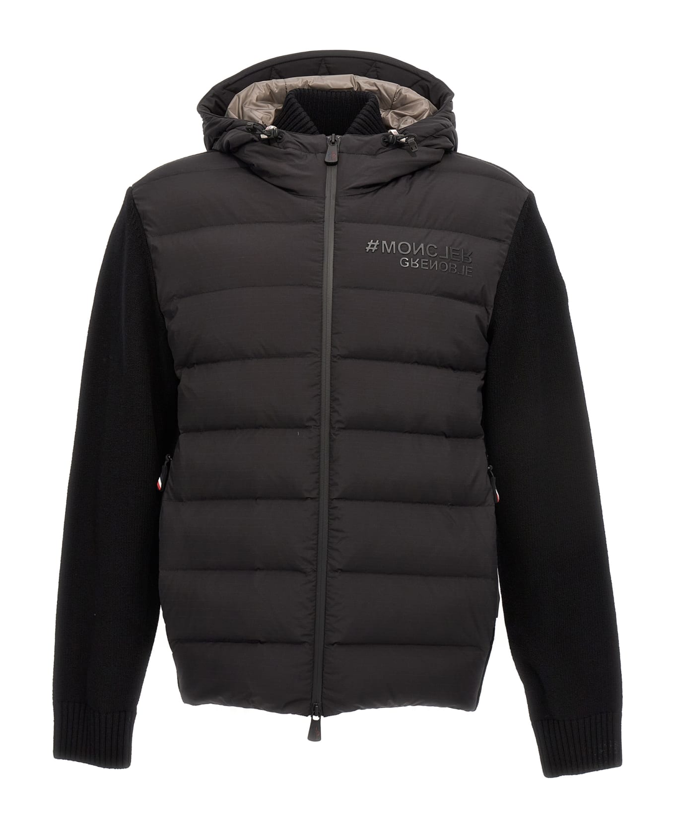 Two-material cardigan with zip closure, part padded with goose down and down jackets, with hood.