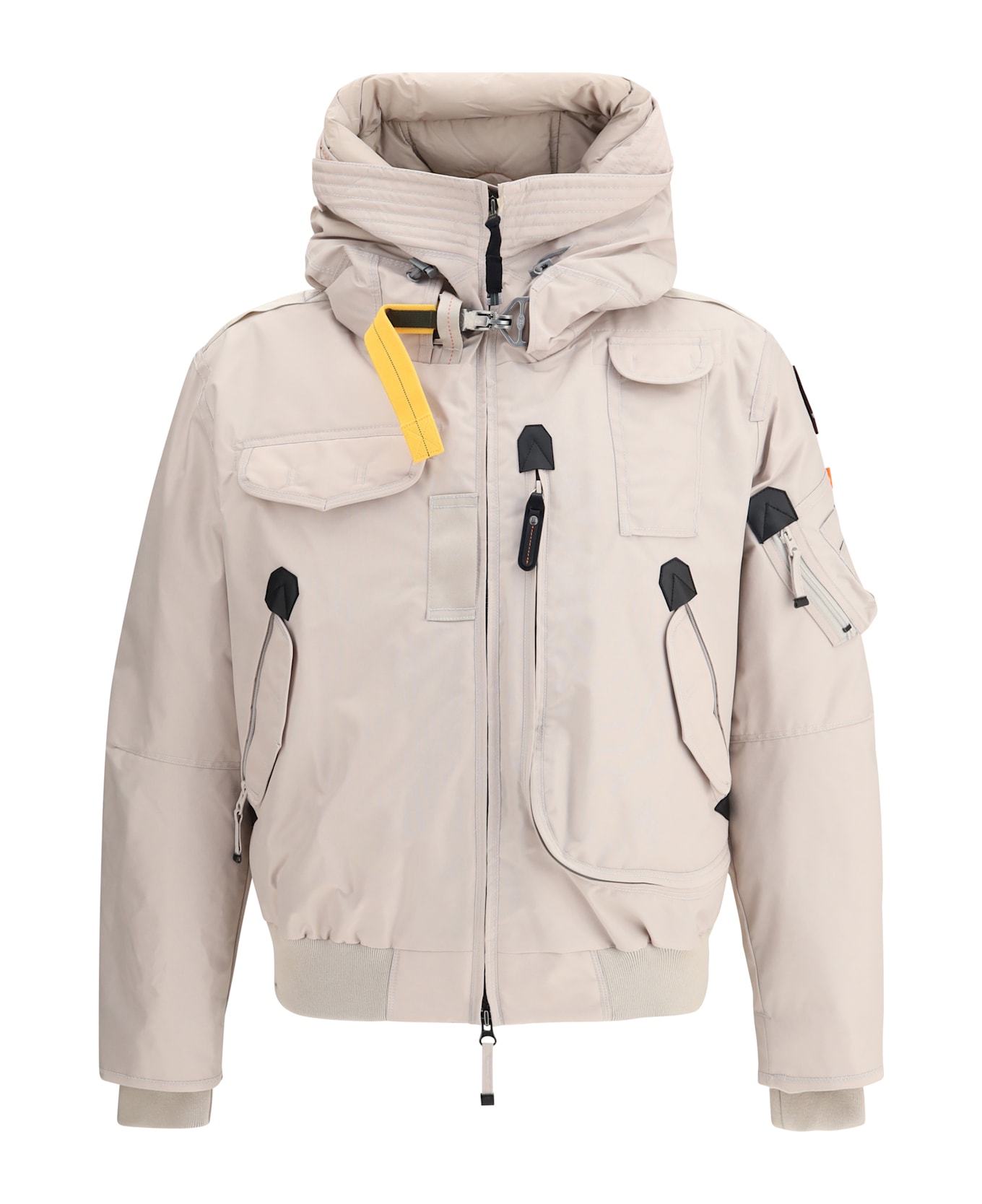 The gobi bomber jacket by parajumpers is made of recycled and laminated nylon oxford with a water-repellent treatment. it features a double-slider front zipper closure and adjustable drawstring hood. it has six exterior pockets, including the iconic cargo pocket, and two interior pockets. cuffs and bottom are ribbed for a comfortable fit. completing the design are the parajumpers patch on the sleeve and the iconic removable yellow tape hook and loop neck closure.