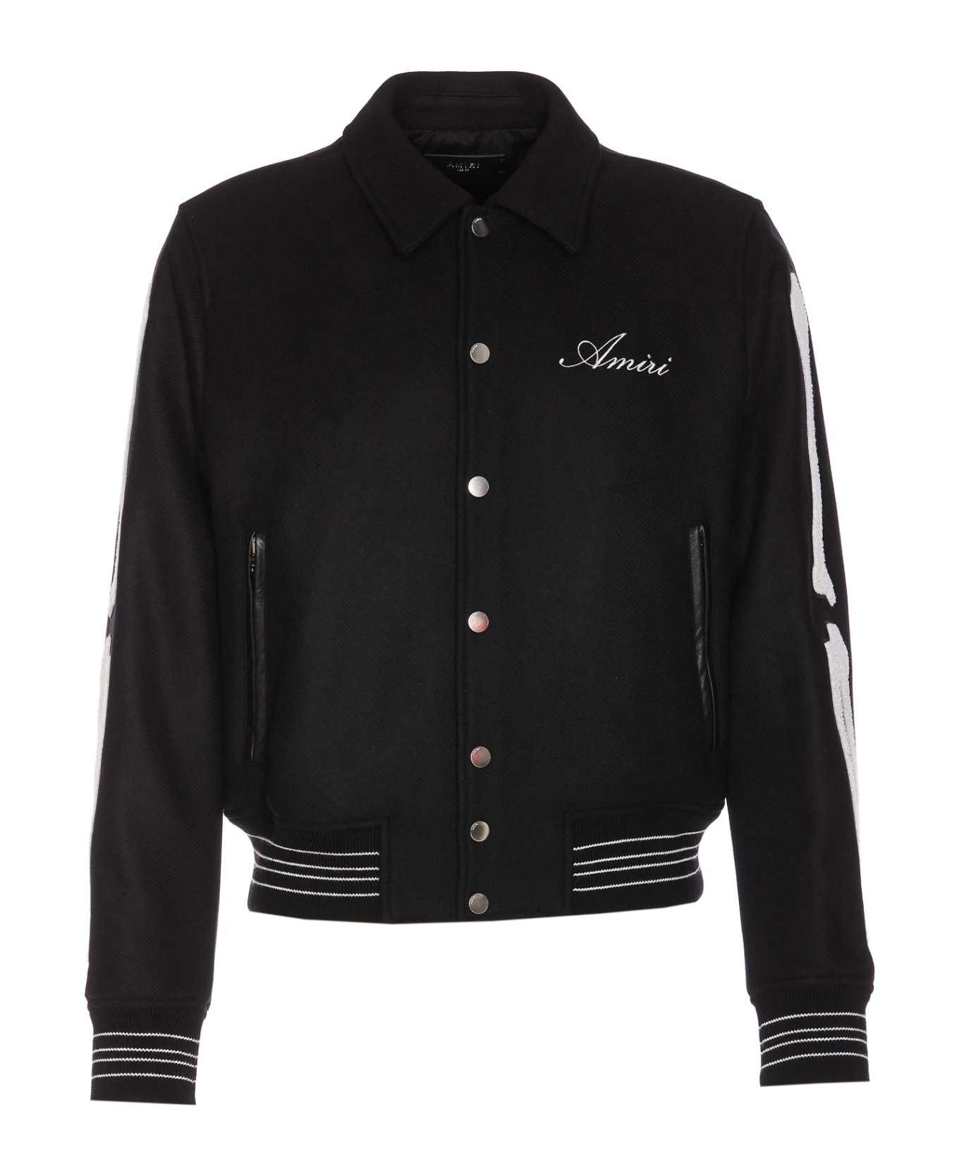 Amiri black Bones Varsity jacket, frontal buttons closure, regular collar, embroidered logo on the front, zip pockets, elasticized on waist and on cuffs Composition: 75% Wool, 25% Nylon, Ovine Leather, 100% Viscose