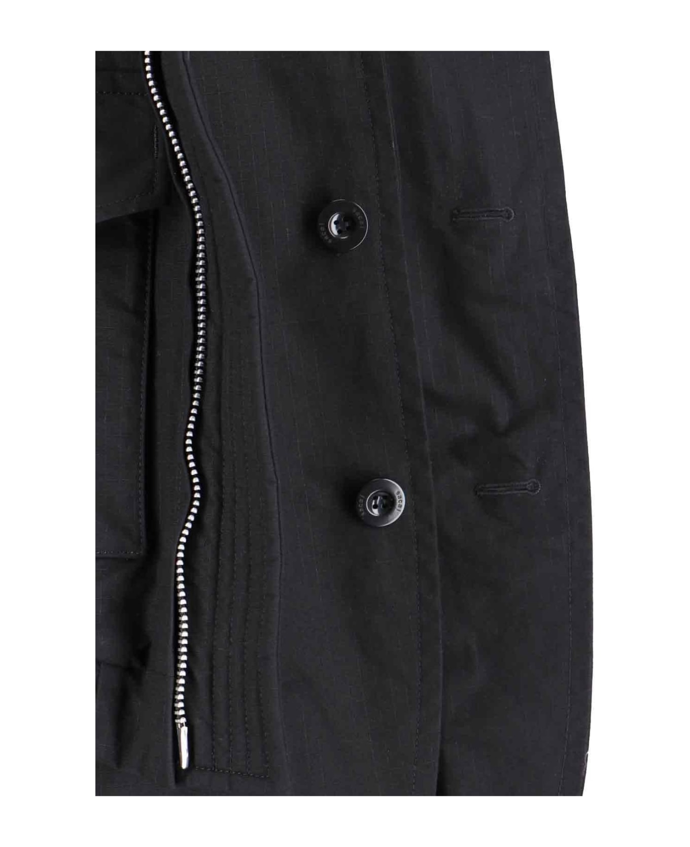 Sacai crop zip jacket in black cotton blend with classic tone-on-tone shirt design, crewneck, double zip and button closure, buttons on the cuffs, two front flap pockets, drawstring at the waist, central front split, and straight hem.