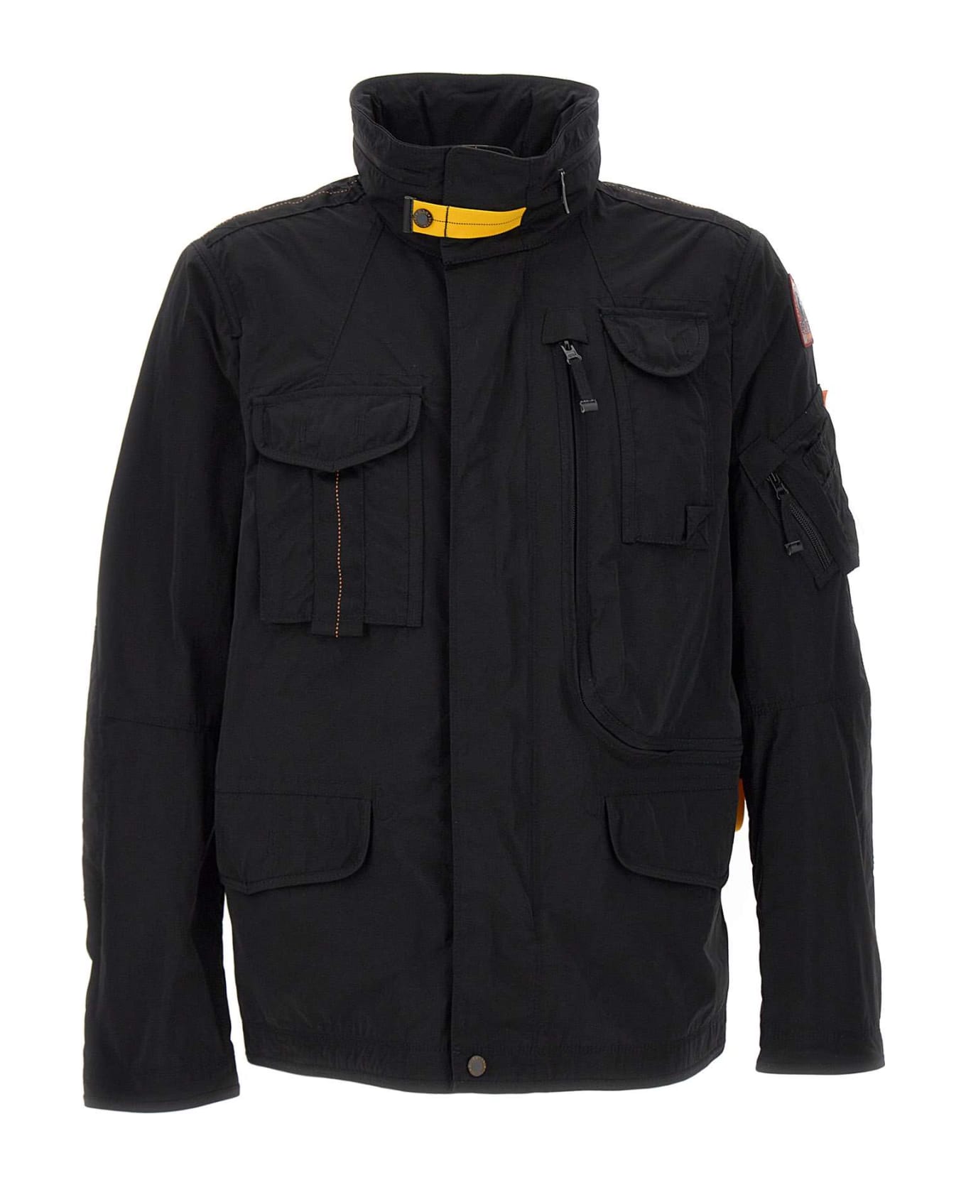 Giacca uomo Parajumpers "Denali", nera, in popeline di poliestere tinto in capo, trattamento idrorepellente, cappuccio con coulisse a scomparsa, chiusura frontale con zip doppio cursore e bottoni, quattro tasche anteriori con patta e bottoni, una tasca interna in rete, ventilazione sotto le maniche, tape giallo iconico sul collo, tasca sulla manica sinistra con logo, fibre Solotex® per la traspirabilità, regular fit, perfetta in alta e bassa stagione.