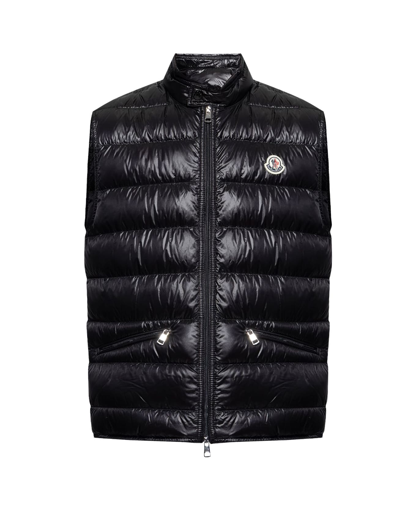 black panelled design padded panels front press-stud and zip fastening mock neck logo patch at the chest sleeveless straight hem