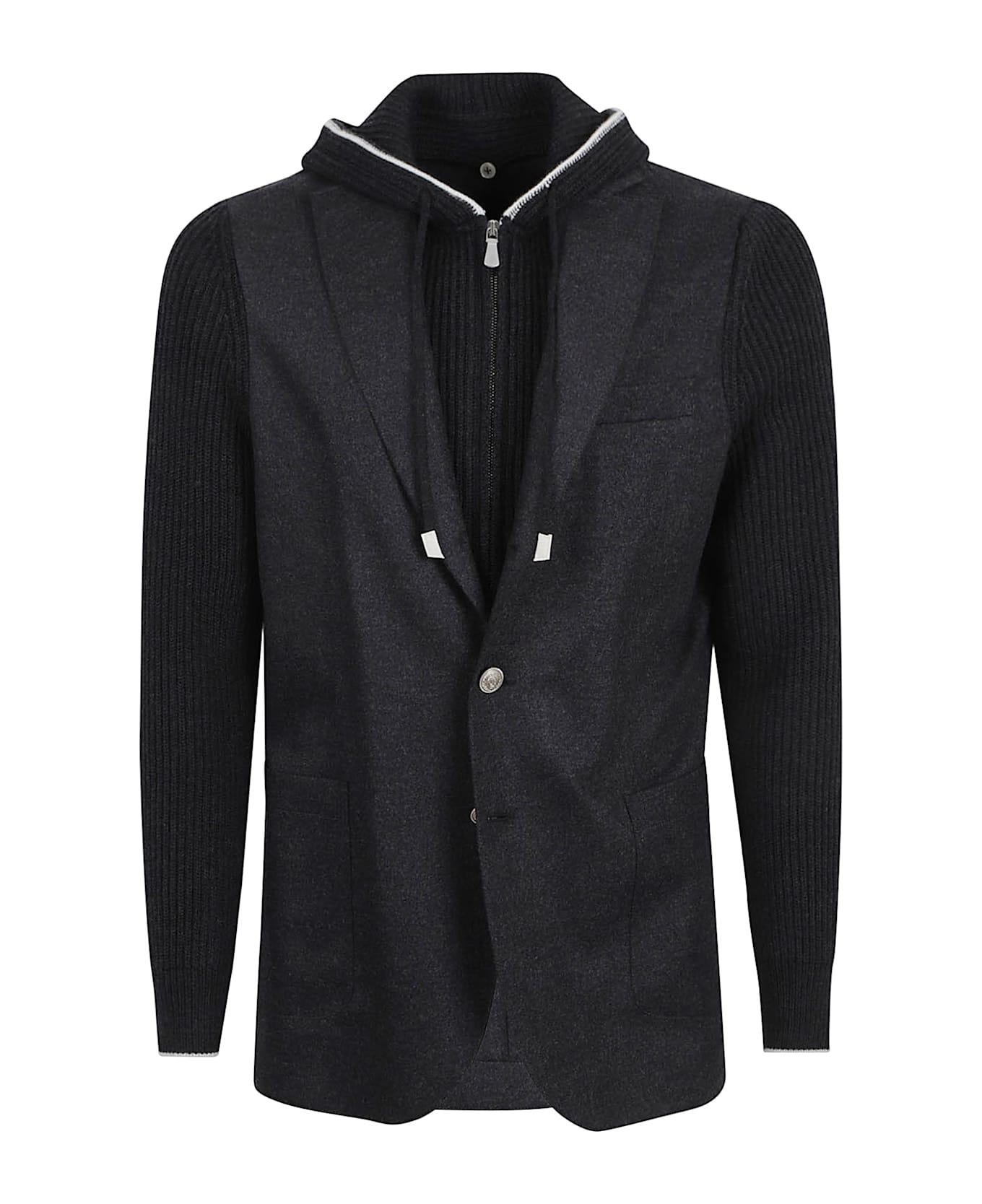 Cotton pique jersey jacket by ELEVENTY. Double logo button closure; two patch pockets and one welt pocket; removable hood and bib. Featuring ribbed cotton knit sleeves and bib.
