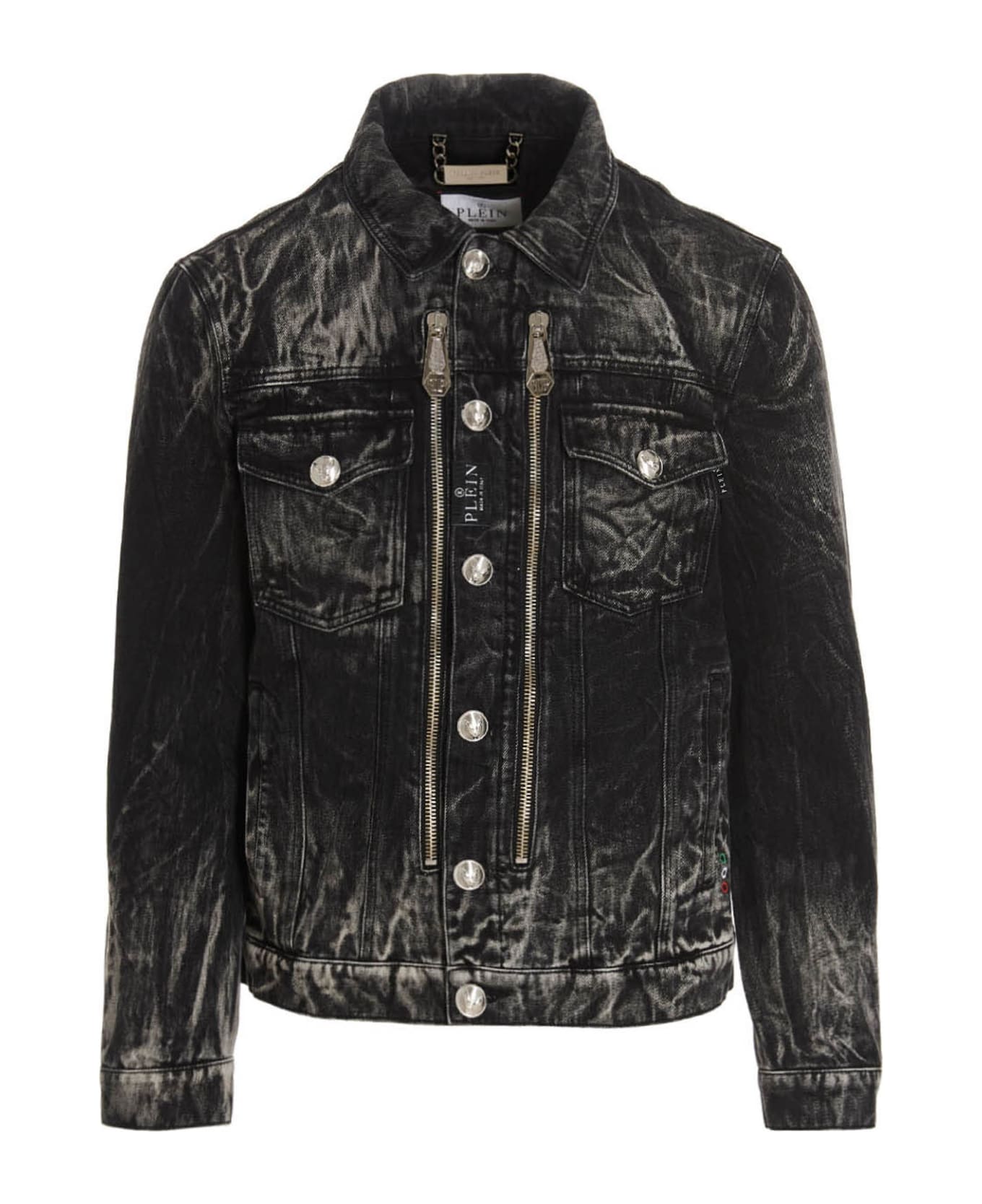 Cotton denim jacket featuring Panther embroidery detail and a metal logo print at back, a button closure, zipper detail, pockets, long sleeves.
