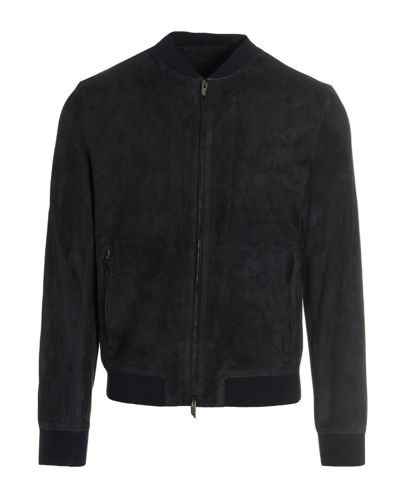Suede bomber jacket featuring lacing, pockets, and long knitted cuffed sleeves.