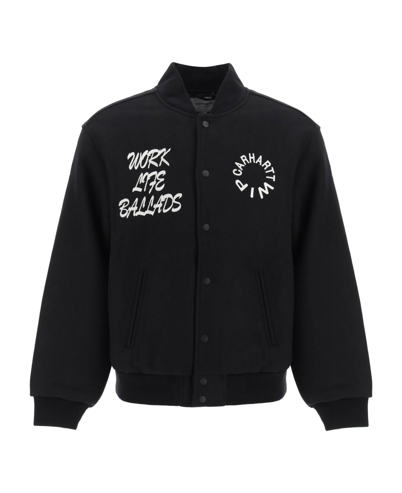 Varsity bomber jacket by Carhartt WIP crafted in techno wool felt with contrasting lettering embroideries at back and chest. It features crew neck, cuffs and hem in ribbed jersey, snap-button closure and side welt pockets. Lined in nylon and provided with an internal pocket. Regular fit. The model is 187 cm tall and wears size L. Composition: 70% PL, 30% WO