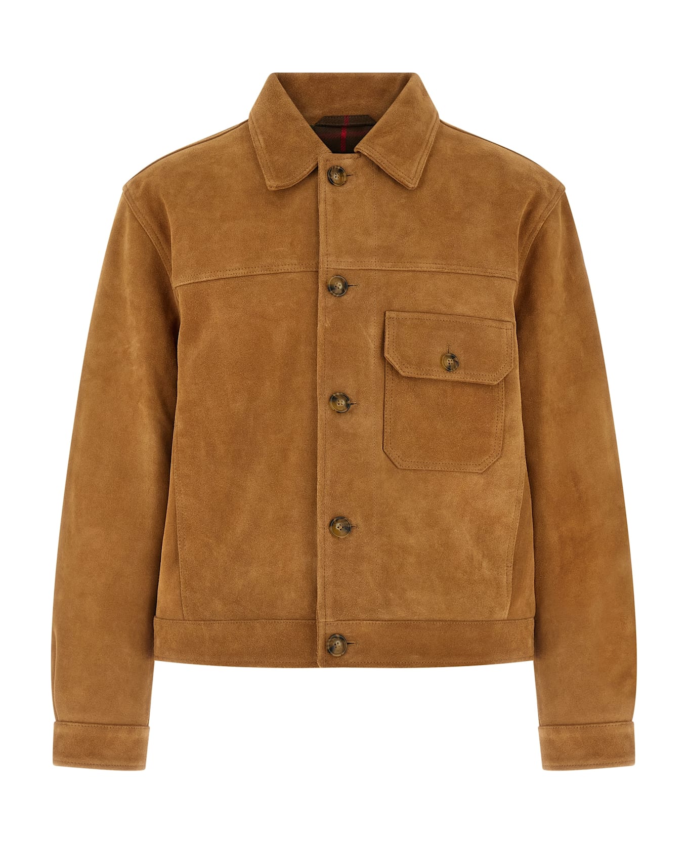 'Roughout' suede jacket with iconic Fraser Tartan lining, motorcycle style, shirt collar, front button closure, pockets, long cuffed sleeves.