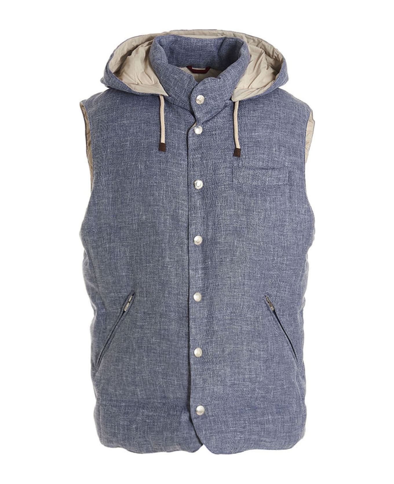 Removable hooded vest crafted in a wool and silk linen blend, a button closure, lining and goose down padding, pockets. Composition: 49% linen 32% wool 19% elastane