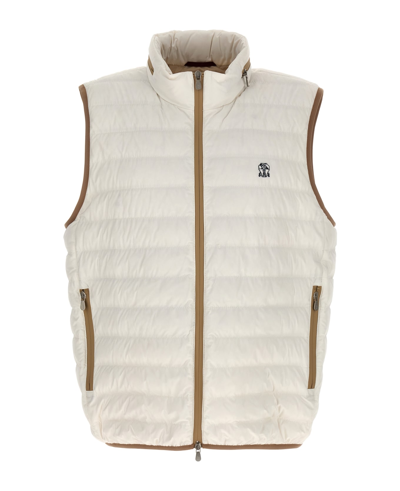 Nylon vest with goose feather padding, front logo embroidery, removable hood, pockets, zip closure. Composition: 83% polyamide, 17% elastane