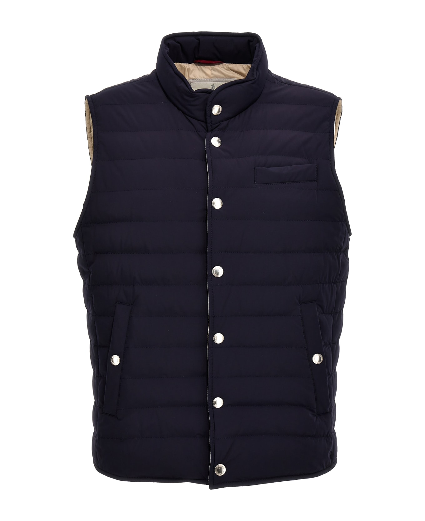 Nylon vest with goose feather padding, button closure, pockets. Composition: 83% polyamide, 17% elastane