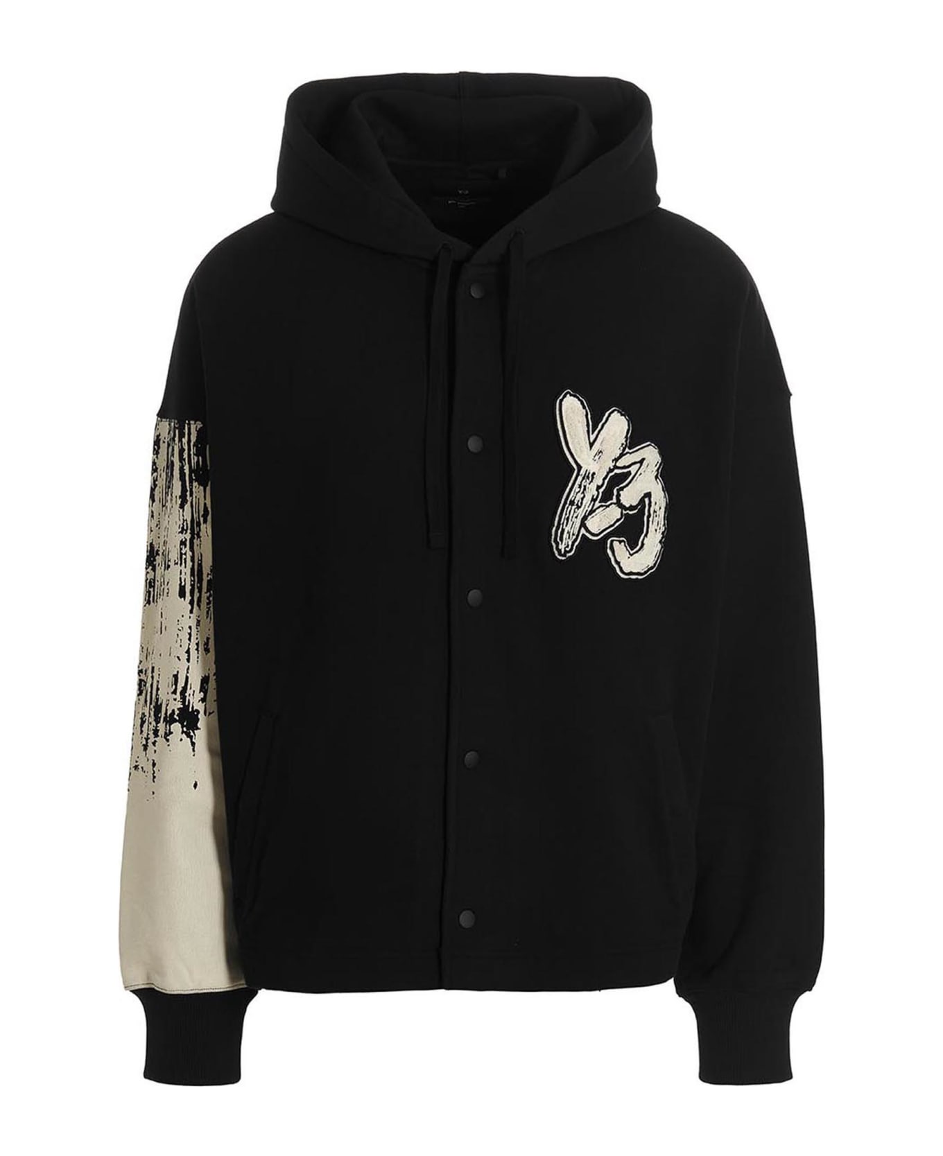 Cotton hoodie with front button closure, paint-effect print, a front logo patch, pockets, and long cuffed sleeves.