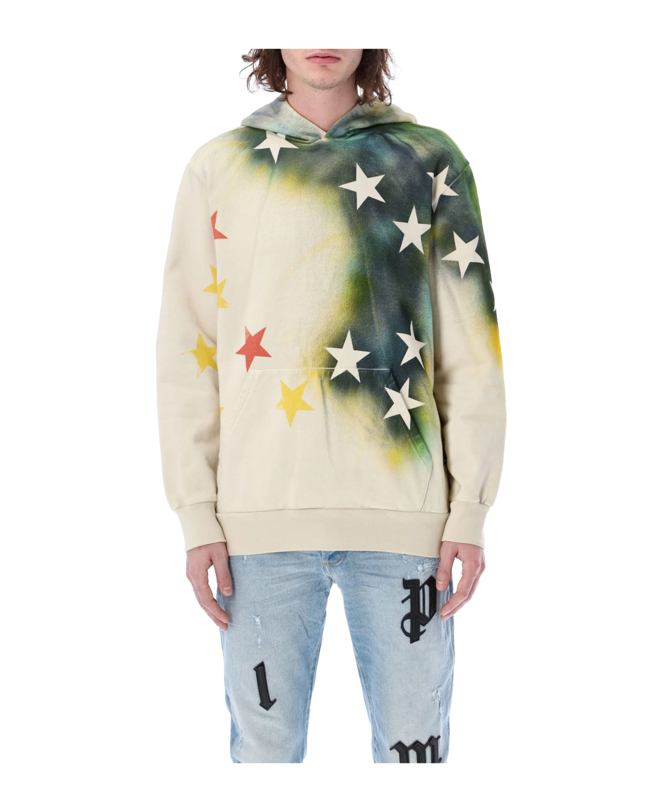 Cotton Sprayed Stars Vint Hoodie By Palm Angels. Featuring: Fixed Hood With Logo Print Long Sleeves Sprayed Effect And Stars Print All-over Kangaroo Pocket Rib Trims The Model Is 1,90 M Tall And He's Wearing Size L