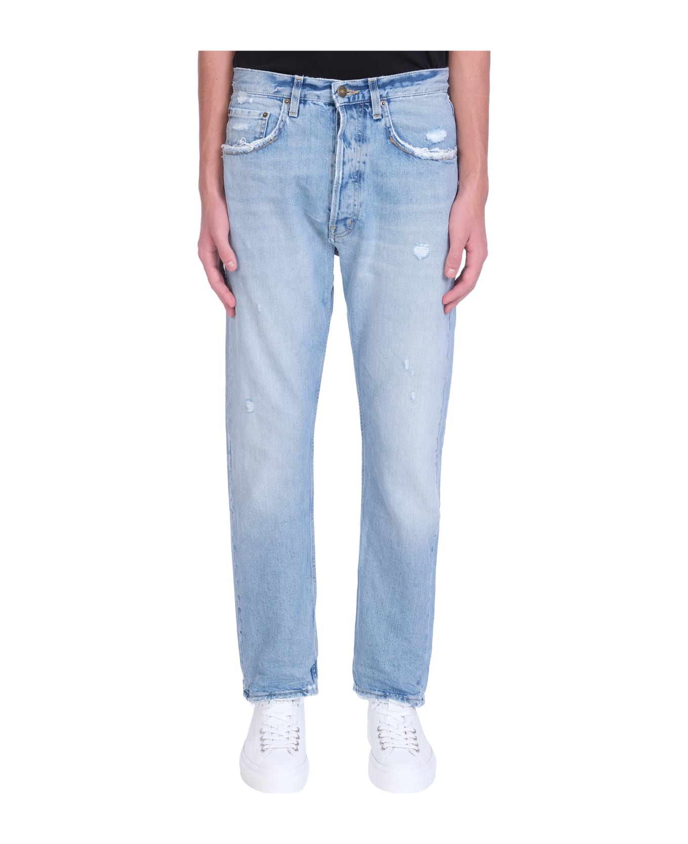 California 1951 Jeans in cyan cotton, waist belt loops, five pockets, 100% cotton, Model is 187 cm and wears size 30, Made in Italy