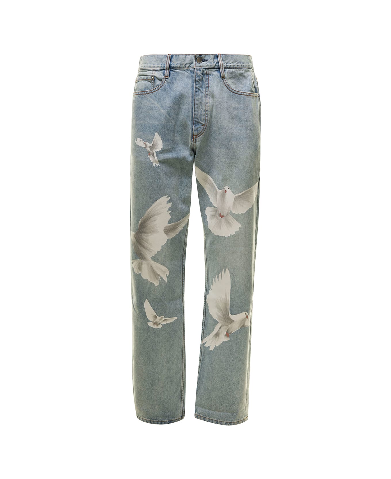 Light Blue Denim Jeans With Dove Print In Cotton Man