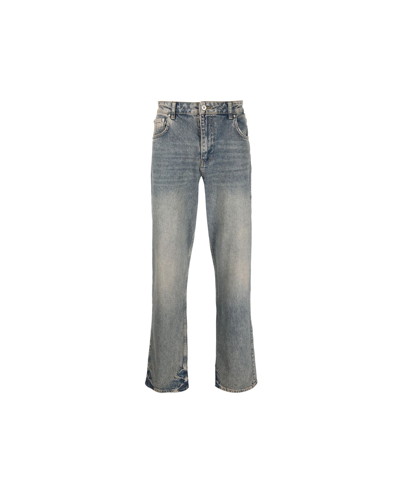 blue denim bleached effect belt loops concealed fly and button fastening classic five pockets straight leg