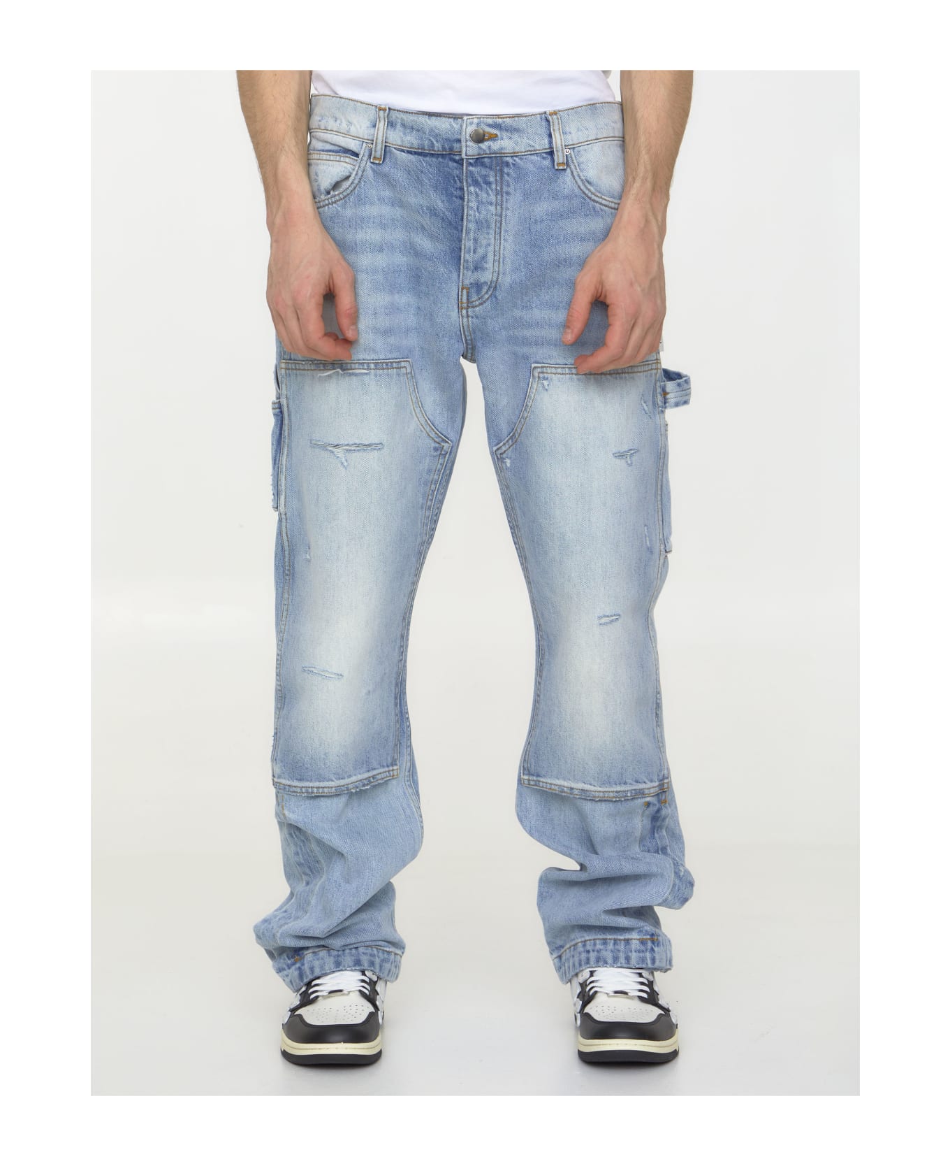 Workwear jeans in washed-out effect blue denim with all-over distressed details. It features zip and button closure, five-pocket design, two cargo pockets on legs, side tab detail, Amiri patch at the back and snap-button hems.