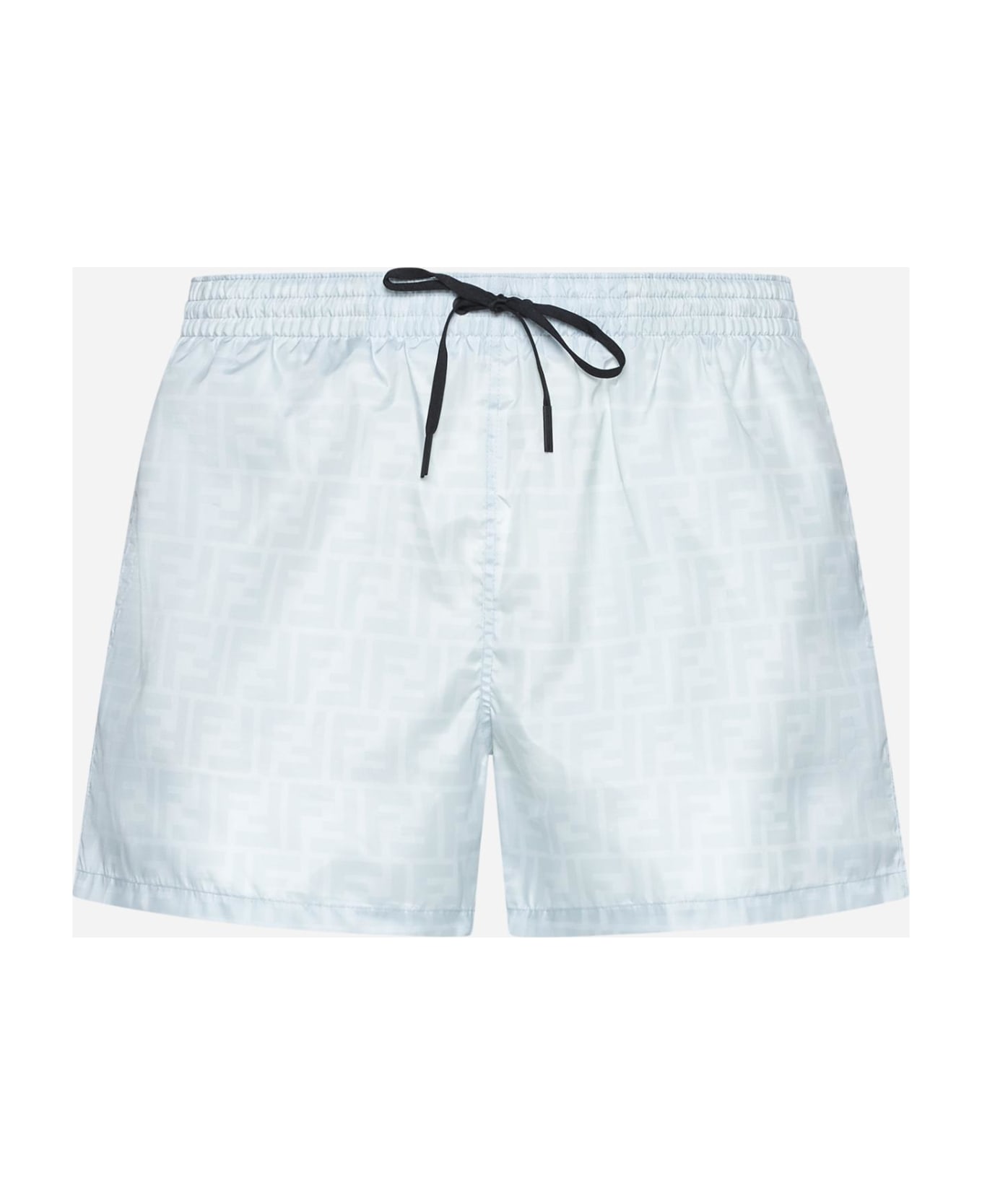Fendi's FF print nylon swim shorts in shades of sky blue with adjustable drawstring at the elasticated waist and side pockets. Composition: 100% polyester