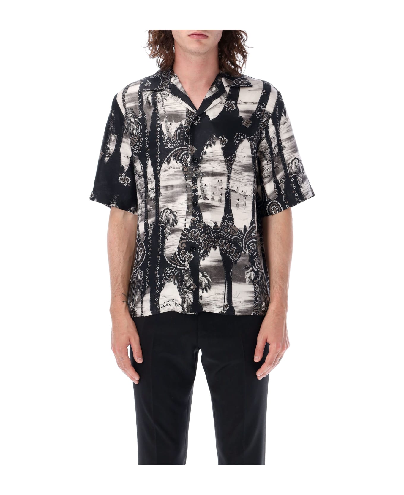 Bowling Shirt By Amiri. Featuring: Silk Bowling Shirt Point Collar Button Fastening Short Sleeves Black And White Fantasy Pattern Model Is 1,90 M Tall And He Is Wearing Size L