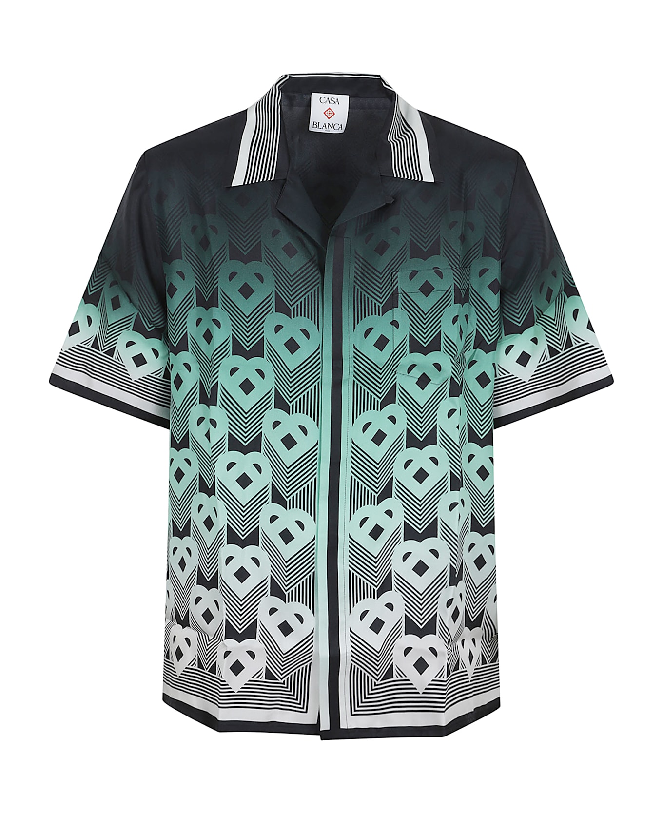 CASABLANCA Gradient Monogram silk twill shirt. Classic shirt collar; concealed button closure; short sleeves; relaxed fit. Featuring an all-over print with the house`s heart monogram in a mint shade that echoes the color palette of the Park Hyatt, an iconic Tokyo hotel that uses mint and black tones for its interior design, and a striped detail at the hem.