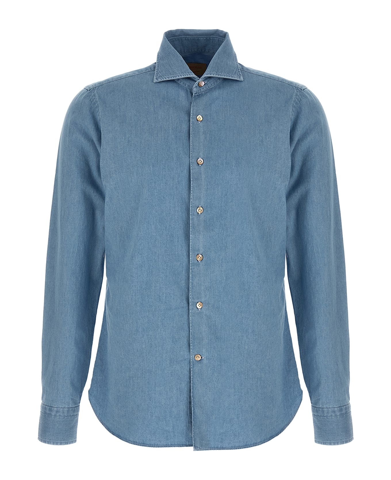 Shirt - Passion line in smooth cotton denim, hand-stitched, Marechiaro Idro collar, mother-of-pearl button closure at the front, long sleeves with cuffs, rounded hem.
