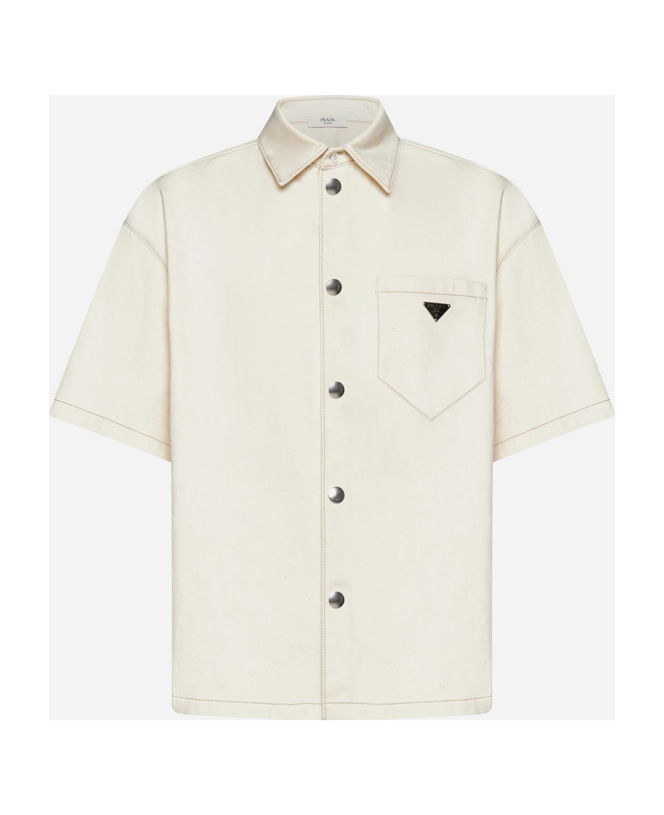 Prada's oversized short-sleeved shirt in off-white denim featuring a pointed collar, front buttoning, chest pocket with triangle logo plaque and straight hem. Composition: 100% cotton